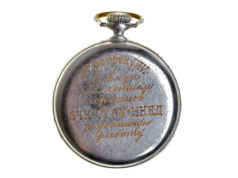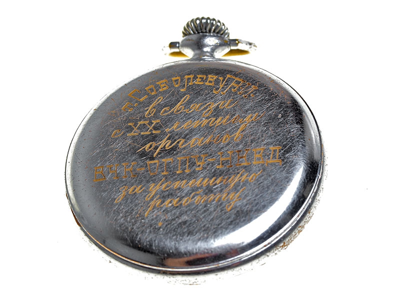 Наградные карманные часы в никелированном корпусе с гравированной надписью на задней крышке: "Т. Соболеву Н.И. в связи с ХХ-летием органов ВЧК - ОГПУ - НКВД за успешную работу". Часы изготовлены 1-м Государственным часовым заводом им.Кирова, механизм на ходу, очень хорошее состояние. Награждения часами были популярны в то время, особенно в органах НКВД - тем более что к 20-летию органов не было изготовлено ни памятного знака, ни жетона. Такие часы обязательно заносились в послужной список наряду с имевшимися наградами и ценными подарками.