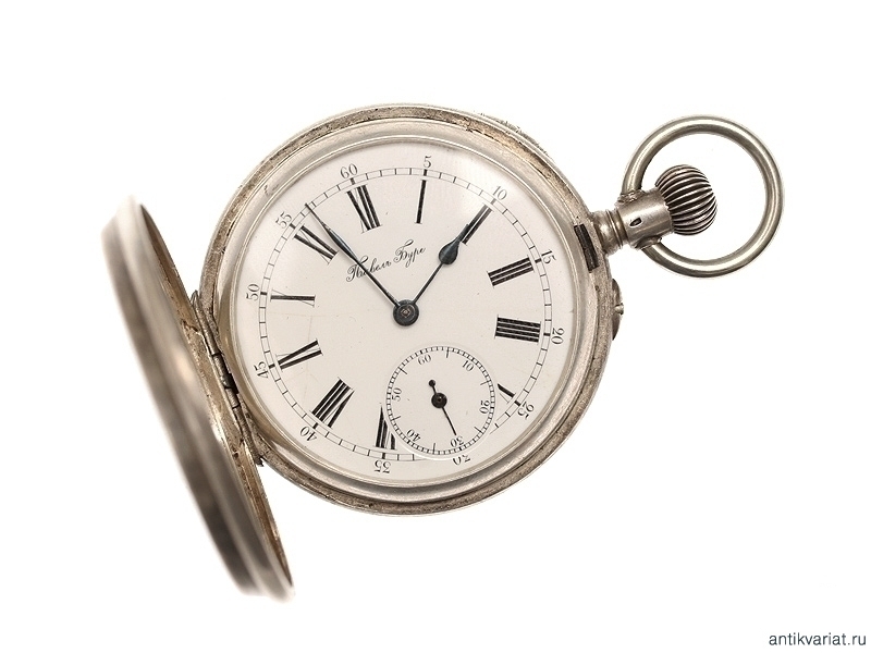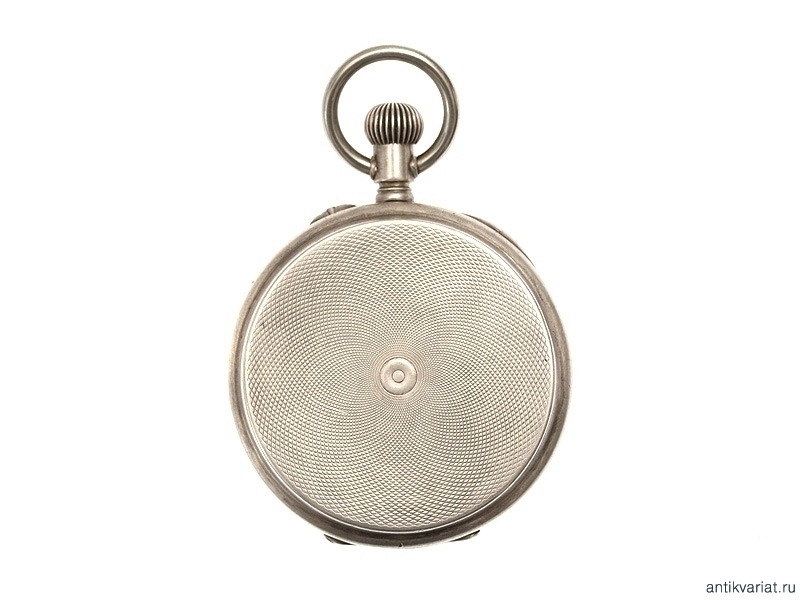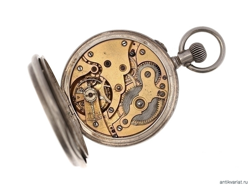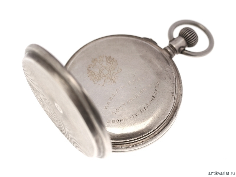 Призовые карманные трехкрышечные часы в серебряном корпусе с рельефным изображением на верхней крышке артиллерийского расчета. Изготовлены фирмой "Павелъ Буре". Именные.