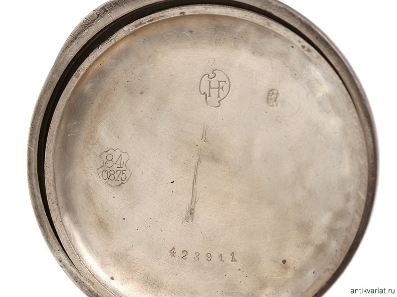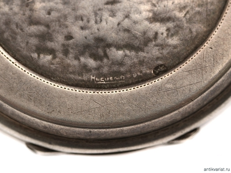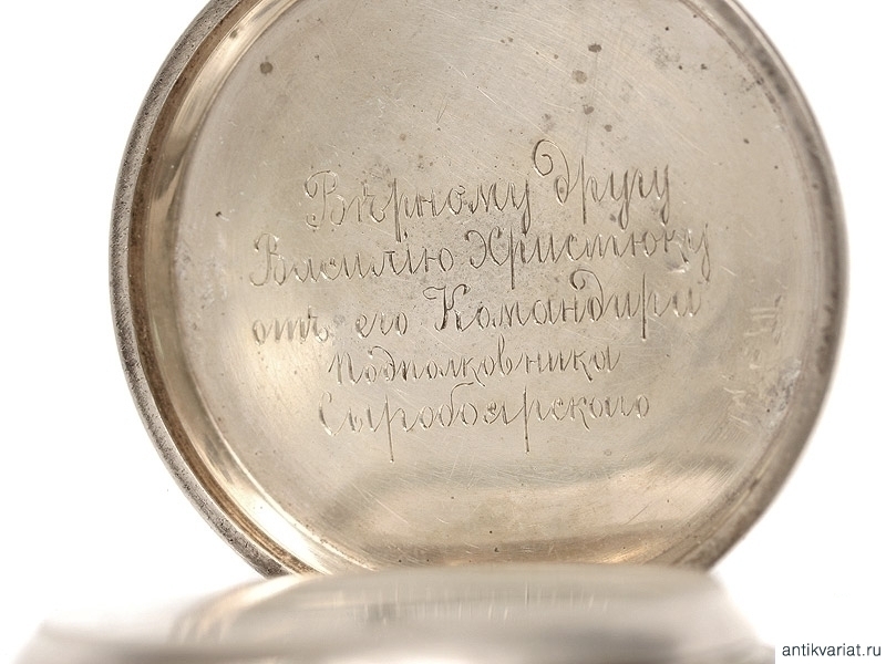 Серебро 84 пробы, №423911. На внутренней стороне крышки - клеймо производителя "Павелъ Буре Поставщикъ двора Его Величества". А также имеется гравированная подарочная надпись "Верному другу Василию Христюку от его командира подполковника Сыробоярского".