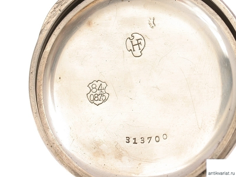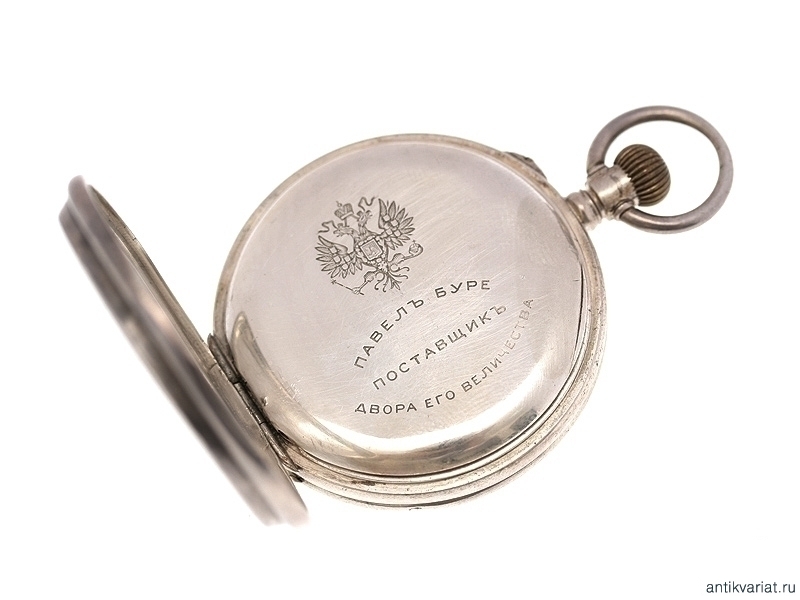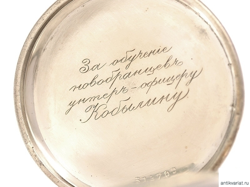 Серебро 84 пробы, №313700. На внутренней стороне крышки - клеймо производителя "Павелъ Буре Поставщикъ двора Его Величества". А также на часах выгравирована наградная надпись: "За обучение новобранцевъ унтеръ-офицеру Кобылину".