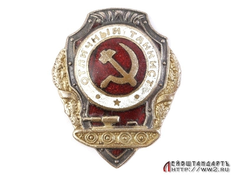 Нагрудный знак "Отличный танкист". Изготовлен из бронзы, эмалевое покрытие в очень хорошей сохранности, на белой эмали мелкие поверхностные царапины от ношения.