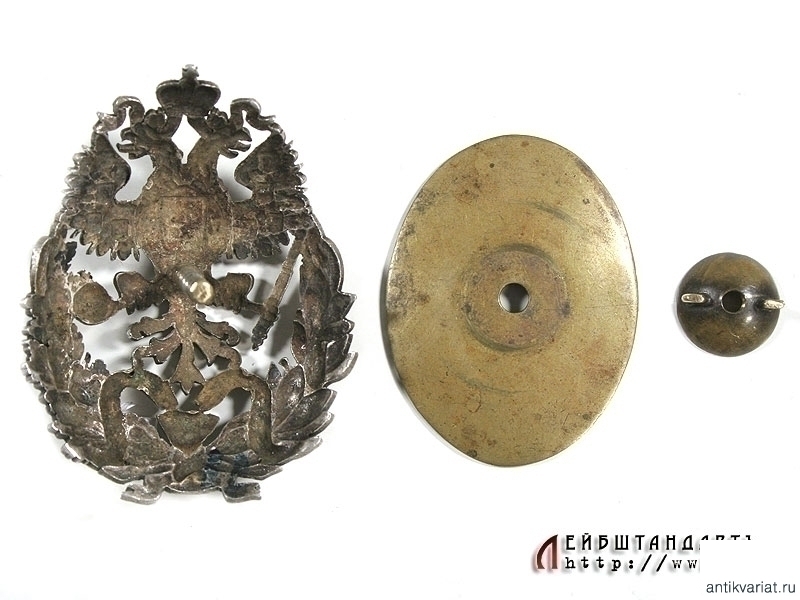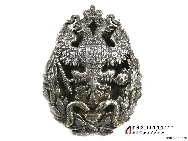 Нагрудный знак врача, удостоенного ученой степени Доктора (в Императорской Медико-Хирургической Академии и Российских Университетах) в очень хорошем состоянии. Представляет собой посеребренный государственный герб, окруженный снизу позолоченным венком из лавровых и дубовых ветвей. У основания венка находится позолоченное изображение чаши Гиппократа с двумя ползущими к ней змеями. Знак изготовлен из посеребренной латуни, на винте. Сохранилась оригинальная закрутка и подложка.