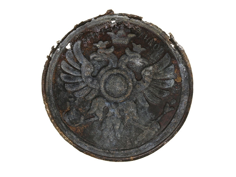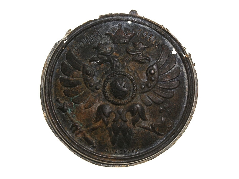 Медная накладка на декоративное блюдце либо подстаканник "Война 1914", изготовленная в мастерской самого известного из ювелиров России - поставщика Двора Его Императорского Величества Карла Фаберже. Представляет собой круглый медальон с рельефным изображением двуглавого орла в старорусском стиле, с надписью "Война 1914" и подписью "К.Фаберже".