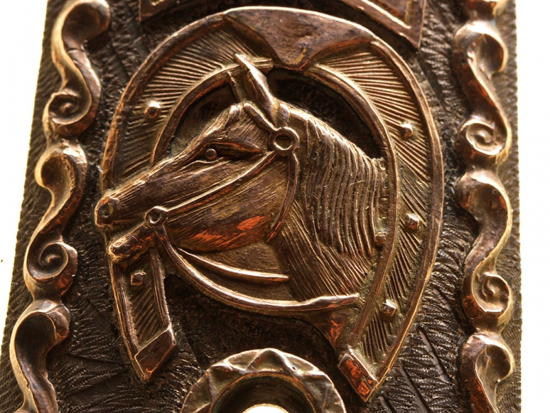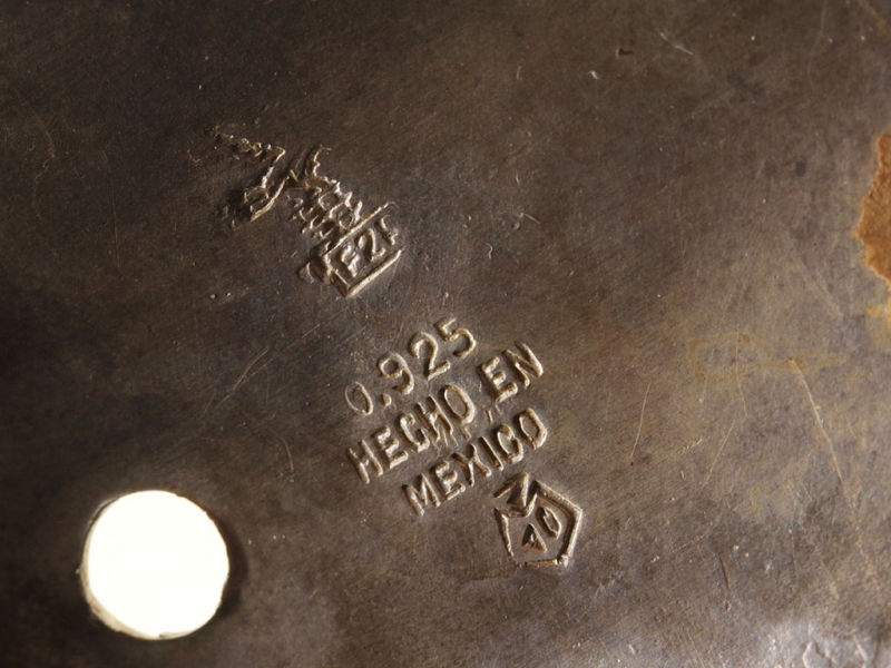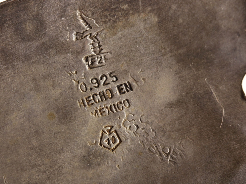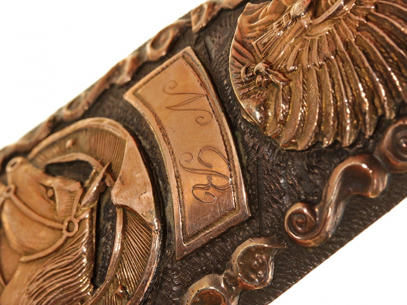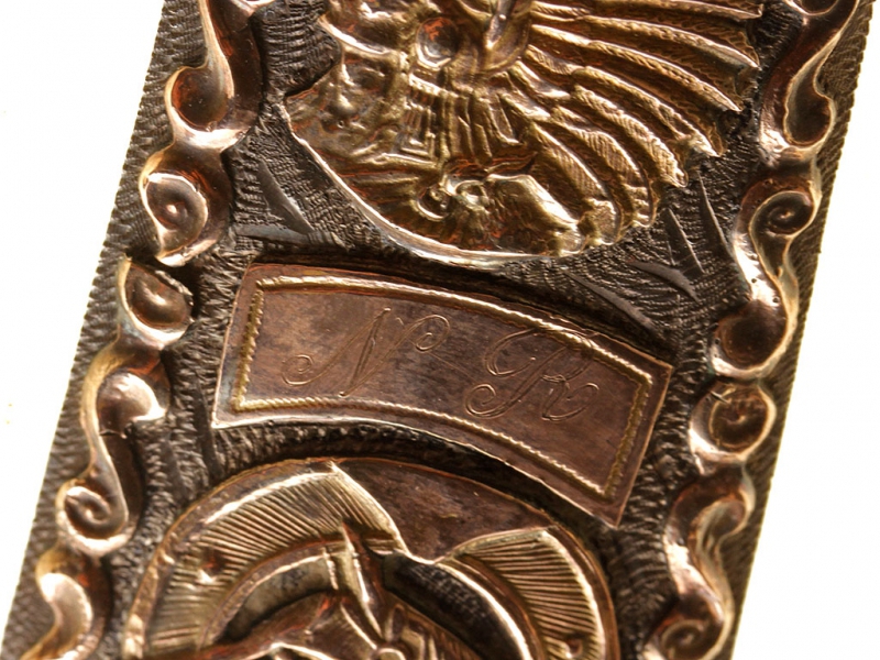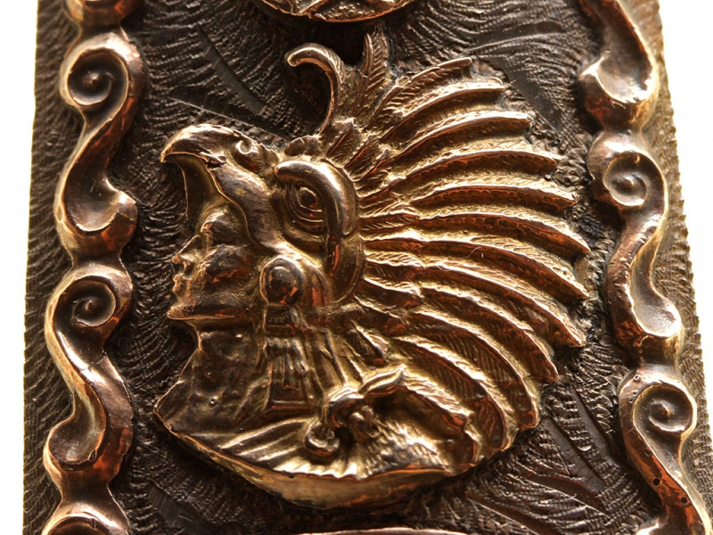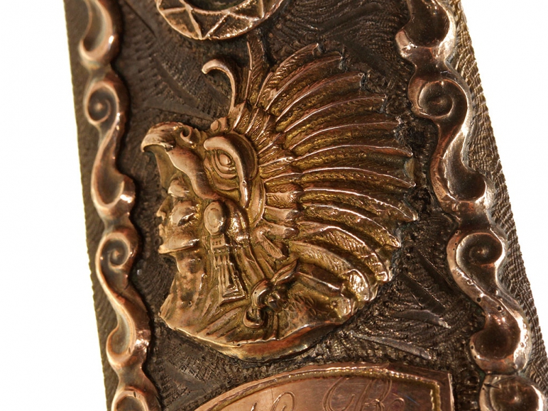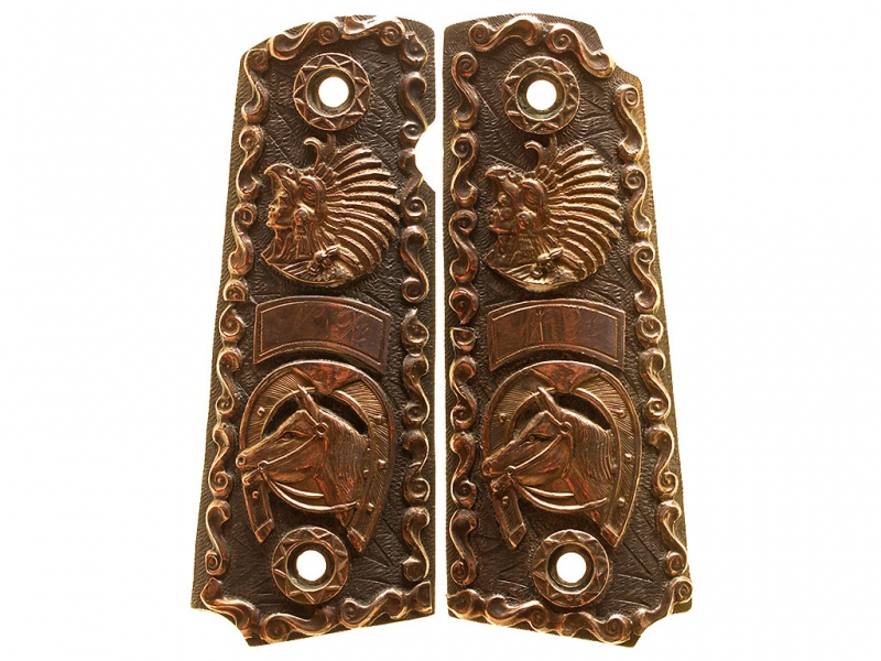 Массивные, очень красивые накладки на рукоятку пистолета Кольт М1911, изготовленные в 1930-е - 1940-е годы. Серебряная (925 пробы) основа украшена тонкой гравировкой, накладки в виде головы индейца, ленты и головы лошади с подковой изготовлены из золота. На ленте выгравирована монограмма владельца: "NR". Имеются клейма Мексиканского пробирного надзора.