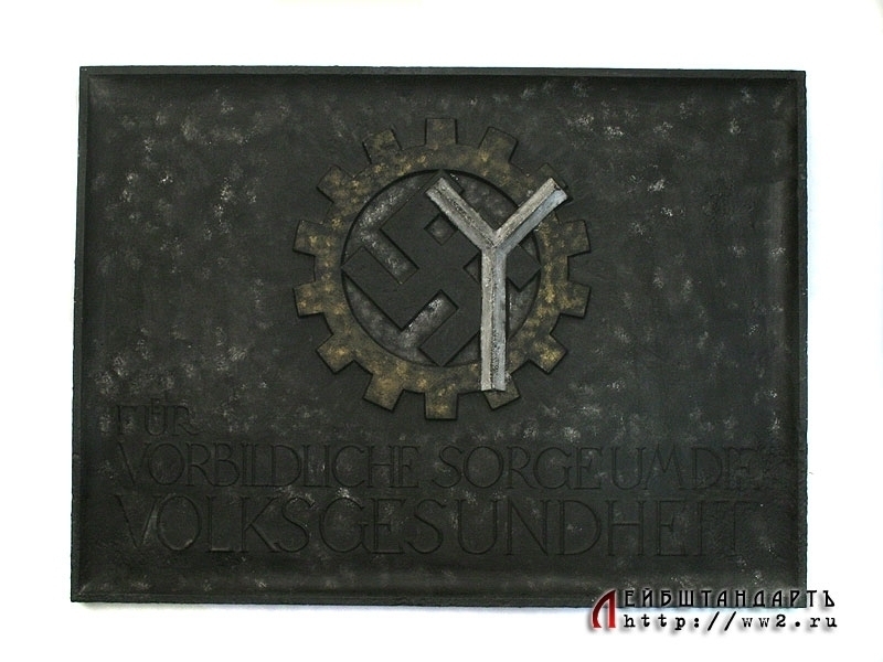 Большая, размером 51,5 х 37,5 см, массивная чугунная плакетка с надписью "За выразительное старание о народном здоровье". Вес около 15 кг. По всей видимости, представляла собой некую коллективную награду - подобную той, которую в советское время получали различные предприятия и учреждения, в виде мемориальной доски, висевшей возле проходной. Отличное состояние.