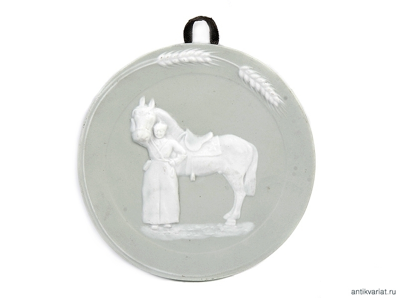 Настенное панно из двуцветного бисквита "Ворошиловский всадник". Изготовлено на Дмитровской фабрике в 1940 году. Картина очень рельефная, попона на лошади со звездой, всадник в кавалерийской шинели и в буденовке. Диаметр 15,5 см. Отличное состояние.