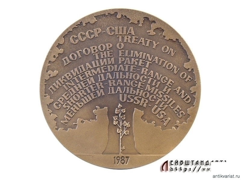 Сувенирная настольная медаль, выпущенная по случаю подписания Договора о ликвидации ракет средней и меньшей дальности между СССР и США в 1987 году. Медаль изготовлена в США из бронзы, отличное состояние. Вручалась всем, кто имел прямое и косвенное отношение к подписанию договора, в основном сотрудникам дипломатических миссий и секретариата.