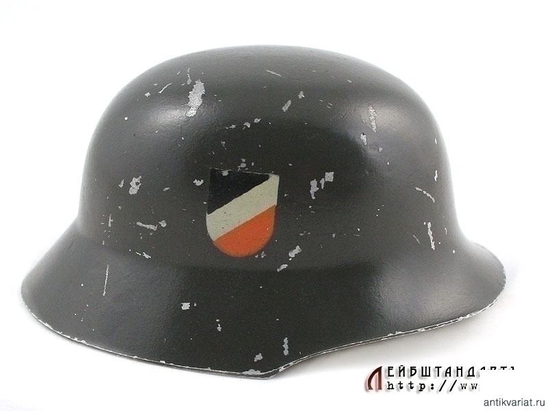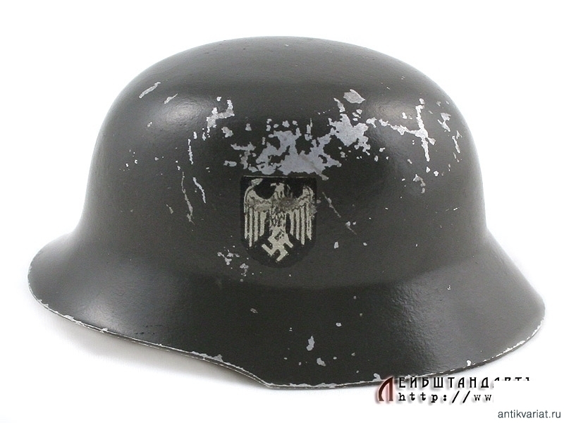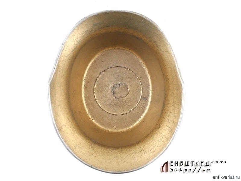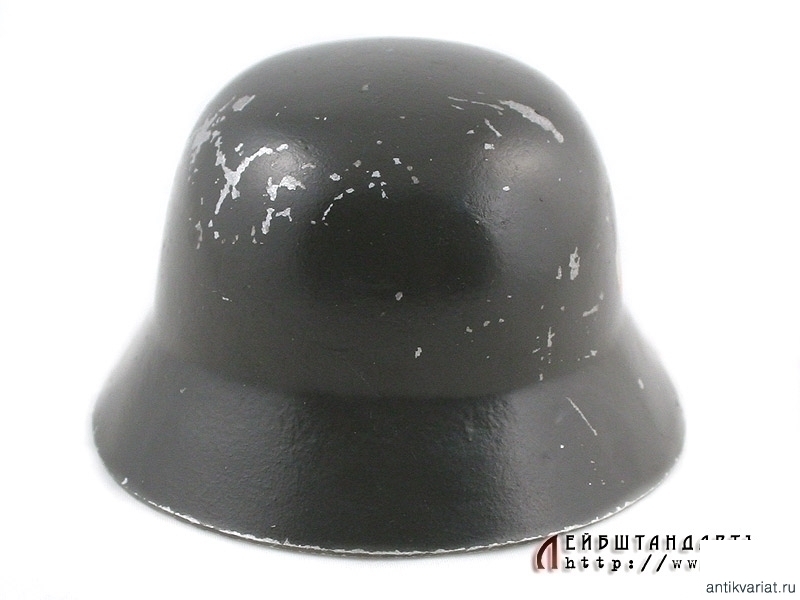 Настольное украшение 1930-х годов в виде германского шлема высотой 5 и длиной 9,5 см. Шлем изготовлен из цинкового сплава, снаружи нанесено красочное покрытие, полностью соответствующее армейскому шлему: по бокам нанесены две миниатюрные декали в виде имперского орла и щитка цветов государственного флага. Изнутри шлем покрыт золотистым покрытием. Антуражный сувенир времен Третьего рейха.