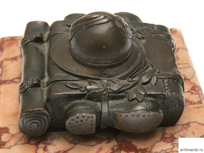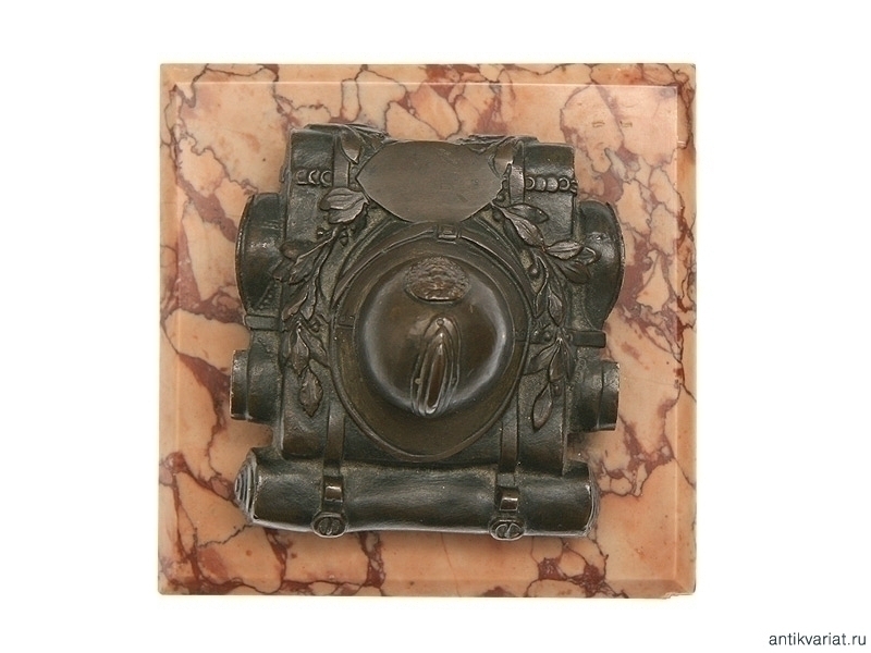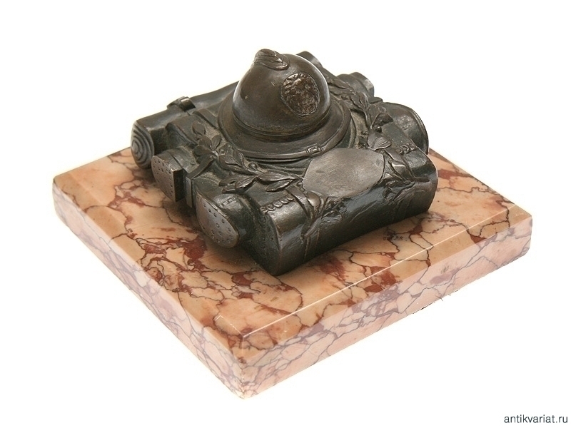 Настольное украшение - пресс для бумаг, представляющий собой миниатюрный набор солдатского походного снаряжения: ранец, скатанную шинель, сапоги и шлем, изготовленные из бронзы и закрепленные на каменной подставке. 1910-е - 1920-е годы. Размер 11,5 х 11,5см, высота 7 см. Отличное состояние.