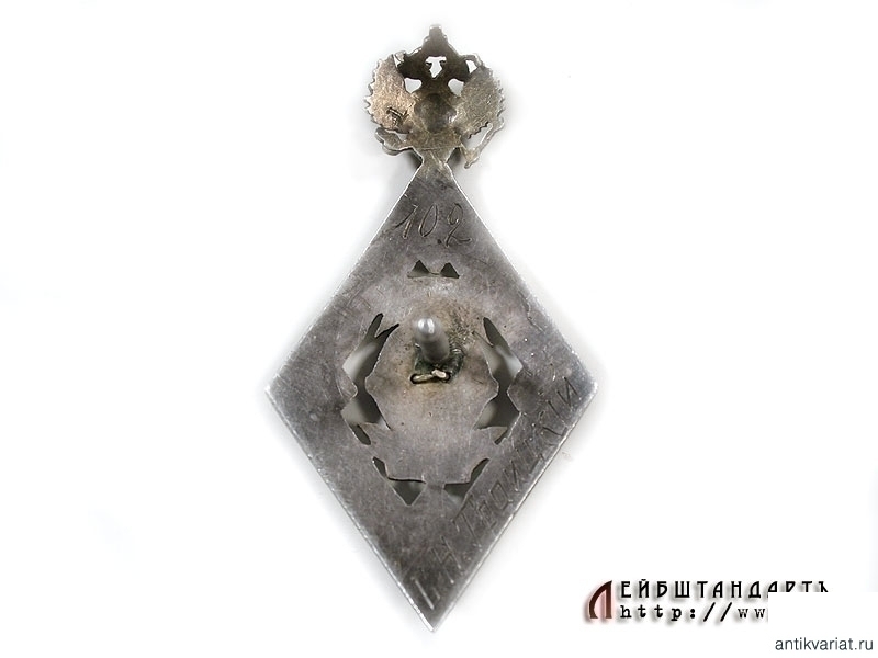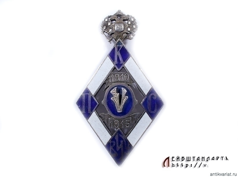 Неатрибутированный нагрудный знак в очень хорошем состоянии. Изготовлен из серебра и покрыт горячей эмалью двух цветов. В центре знака помещена накладная римская цифра "V" и даты: 1910 - 1915. Сокращение: "КПС" и "ВЧУ". На обороте помещен гравированный вручную порядковый номер "102" и фамилия владельца: "С.Н.Троицкiй".
