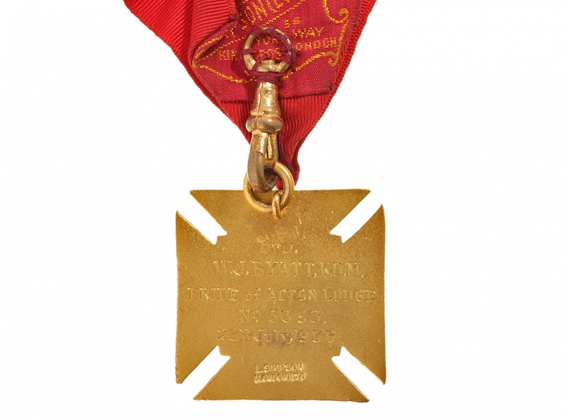 Шейный знак члена масонской ложи "Королевского Ордена Буйволов" (Royal Antediluvian Order of Buffaloes (RAOB). Томпак, золочение, эмаль. На оригинальной шейной ленте с накладными медальонами.