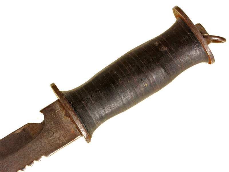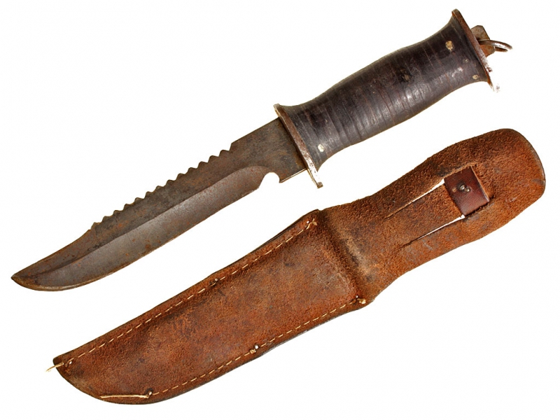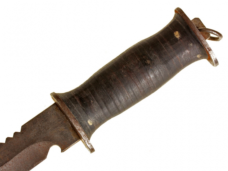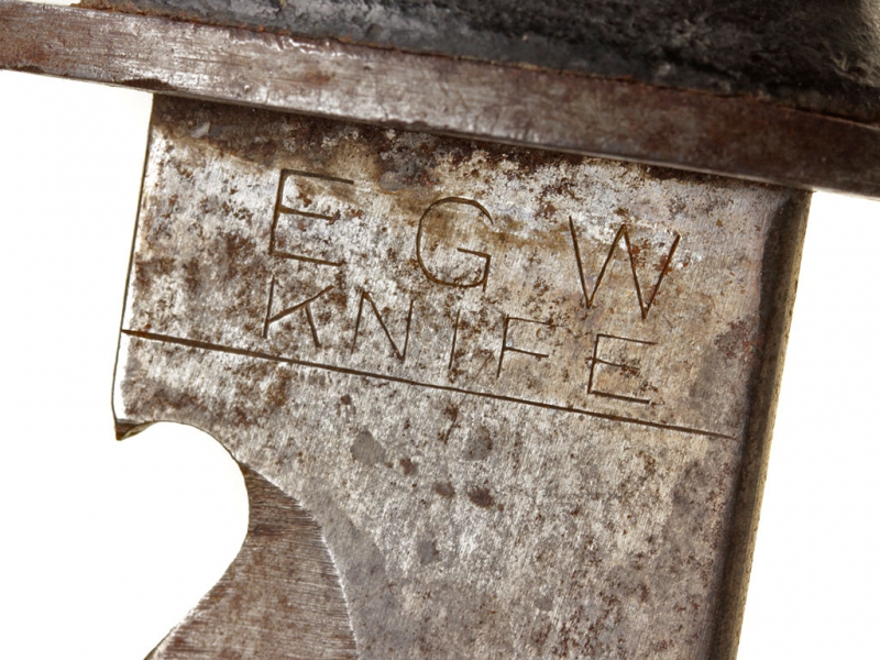 Универсальный армейский нож, изготовленный в годы Второй мировой войны. Клинок с пилой на обухе, у основания клинка - открывашка для бутылок, имеется клеймо изготовителя "E.G.W. KNIFE". Рукоять наборная, из плотно прилегающих друг к другу кожаных пластинок, имеет стальной овальный затыльник с кольцом для ремешка и основание. Ножны кожаные, с фиксатором.