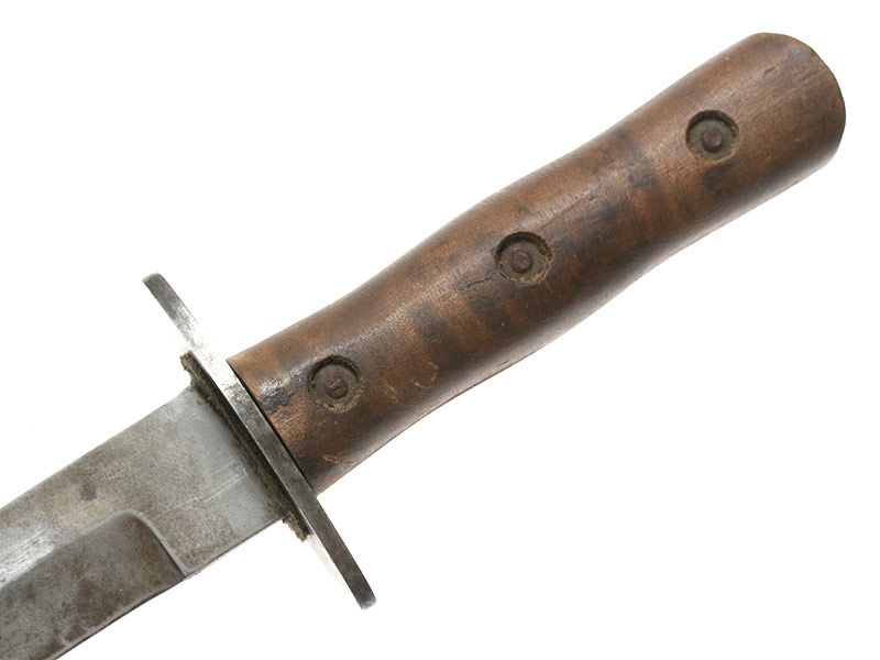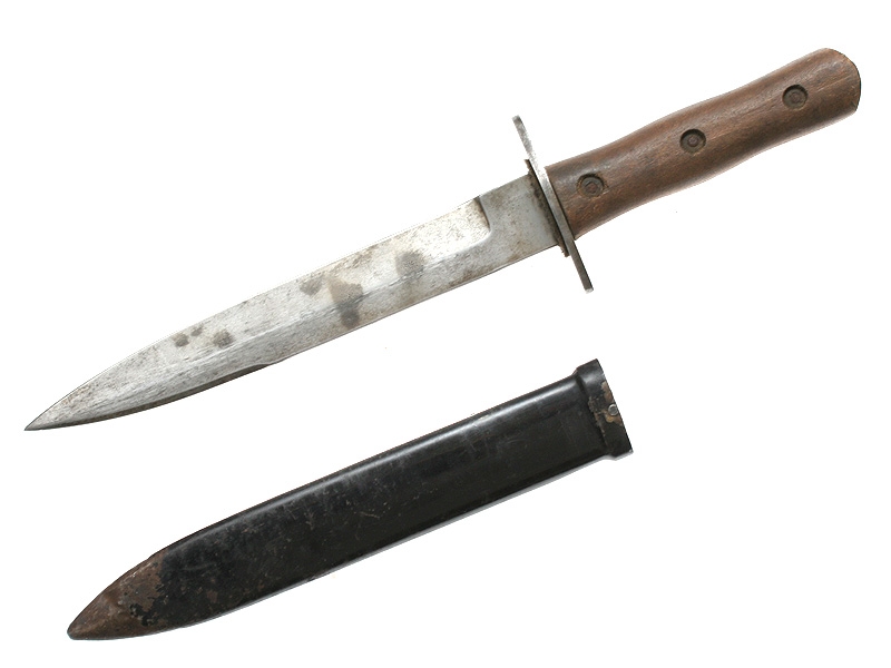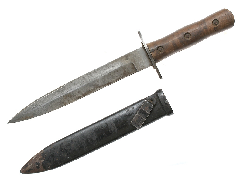 Нож командиров и членов фашистской организации чернорубашечников Италии образца 1935 - 1936 годов. Клинок без клейм. Рукоять из двух деревянных частей, скрепленных между собой. Ножны в оригинальном черном красочном покрытии, с раздвижным карабином для крепления подвеса. Очень хорошее состояние.