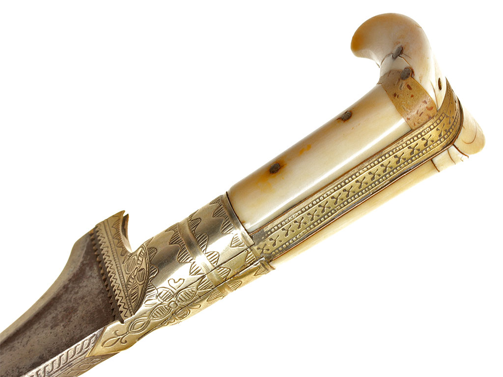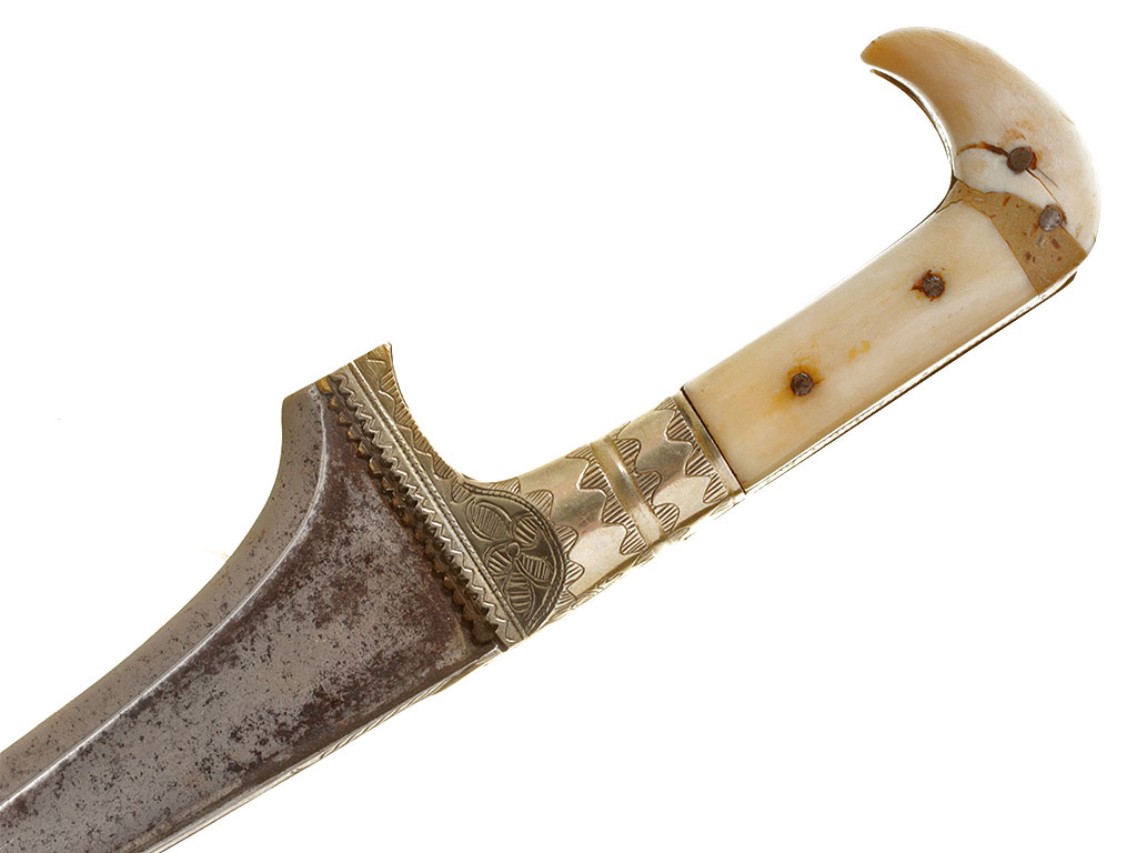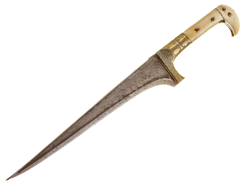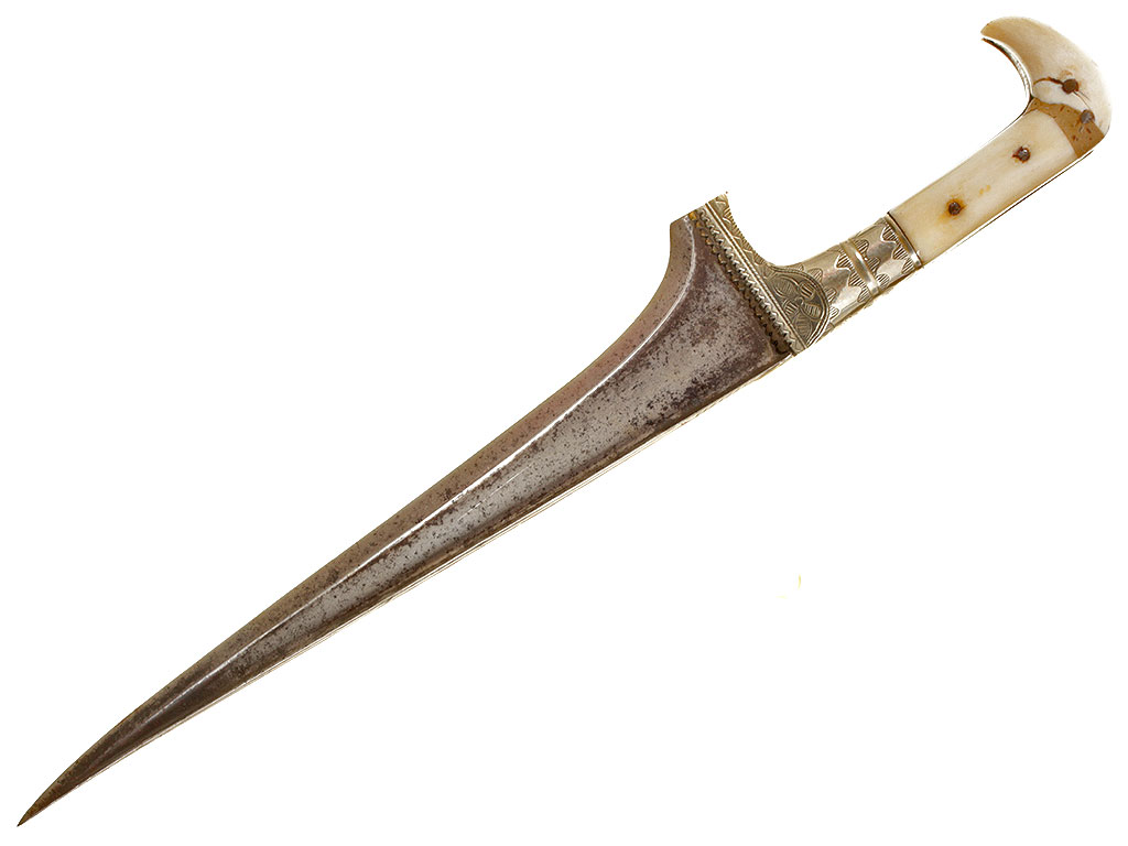 Традиционный нож / кинжал Индо-Персидского региона - Чура, изготовленный в конец XIX начало XX века. Клинок стальной, однолезвийный, прямой, Т – образного сечения. Эфес без гарды, состоит из рукояти и навершия ятаганного типа. Основание и спинка рукояти - из медного сплава, непосредственно же черен состоит из двух выпуклых костяных щечек, скрепленных с хвостовиком клинка металлическими заклепками. Медные части украшены гравированным растительным и геометрическим орнаментом.