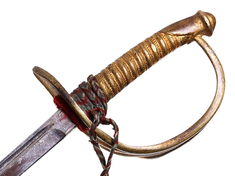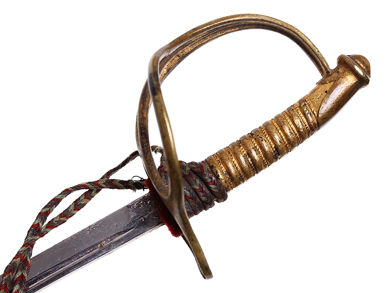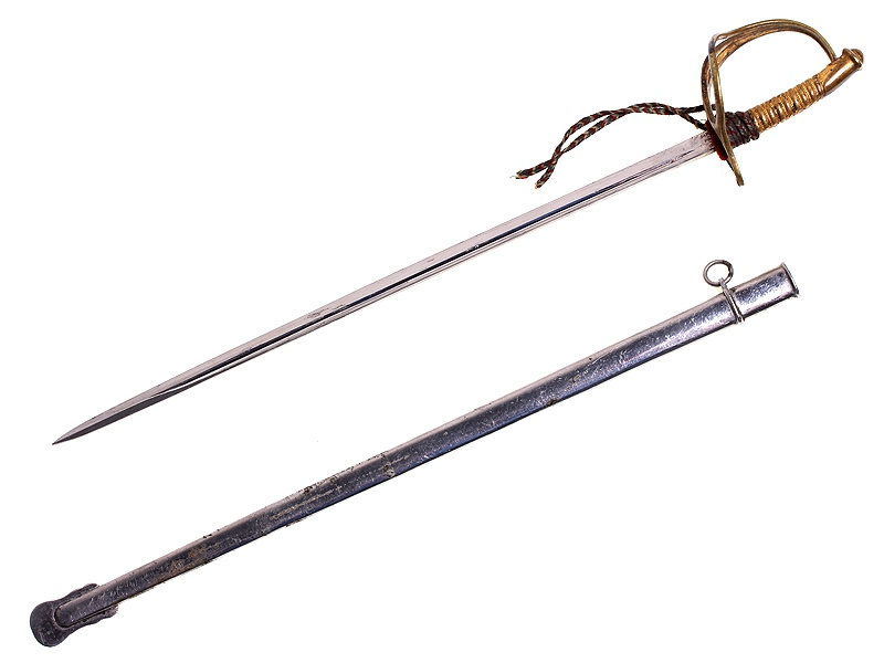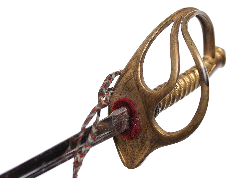 Настольный нож для вскрытия писем, пакетов и разрезания газетных страниц, изготовленный в виде кавалерийского палаша. Клинок без клейм, рукоять и эфес изготовлены из позолоченной бронзы. Ножны металлические никелированные.