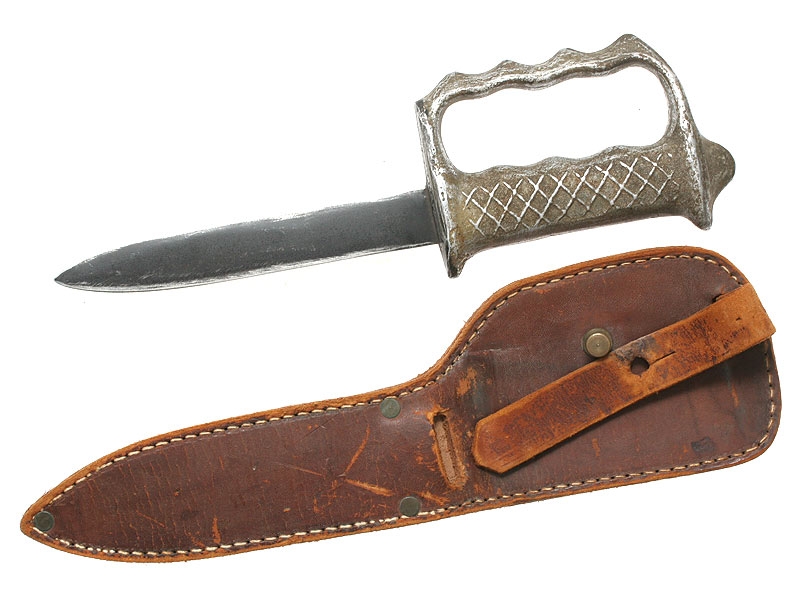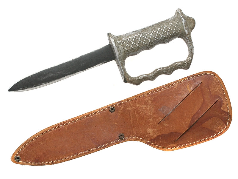 Армейский новозеландский нож-кастет периода Второй мировой войны. Вороненый клинок без клейм, рукоять в виде кастета, изготовленная из алюминиевого сплава. Оригинальные кожаные ножны.