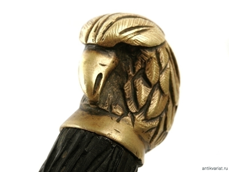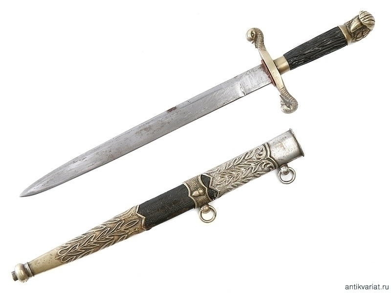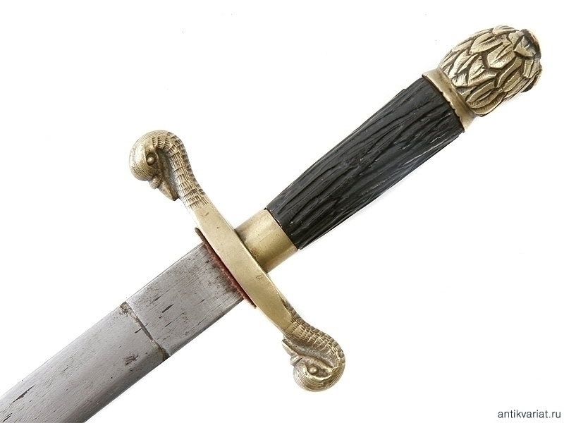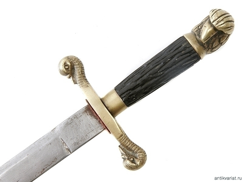 Нож классных чинов корпуса лесничих образца 1904 года. Клинок без клейм, рукоять из черного рога, бронзовый прибор рукояти и ножен со следами серебрения. Начало ХХ века. Очень хорошее состояние.