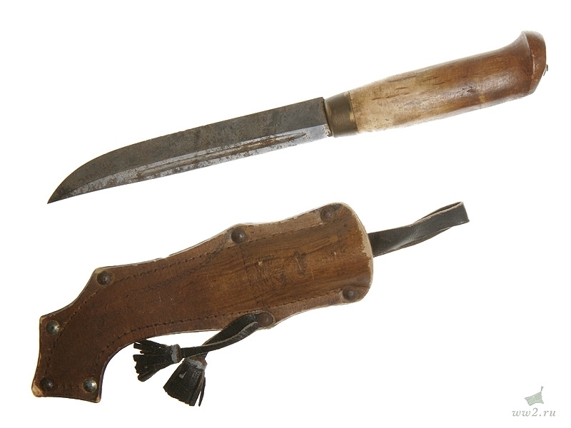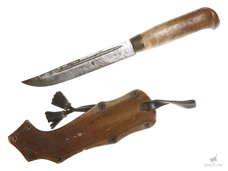 Финский традиционный нож "пукко" общей длиной 26 см. С финской гравированной надписью на клинке, в кожаных ножнах с нанесенным краской изображением лося. Вторая половина 1930-х годов. Хорошее состояние, на клинке следы поверхностной коррозии.