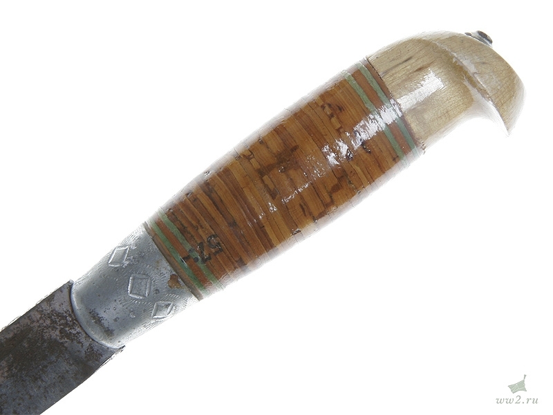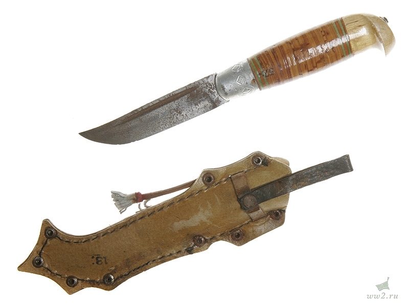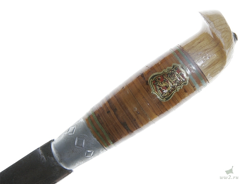 Финский традиционный нож "пукко" общей длиной 19,8 см. С финской гравированной надписью на клинке, в кожаных ножнах, с наклеенным на рукоятке изображением финского герба. Вторая половина 1930-х годов. Хорошее состояние.