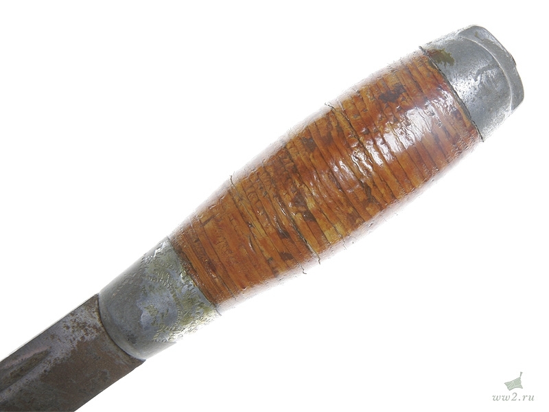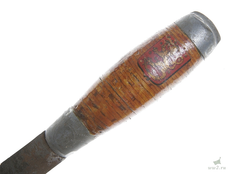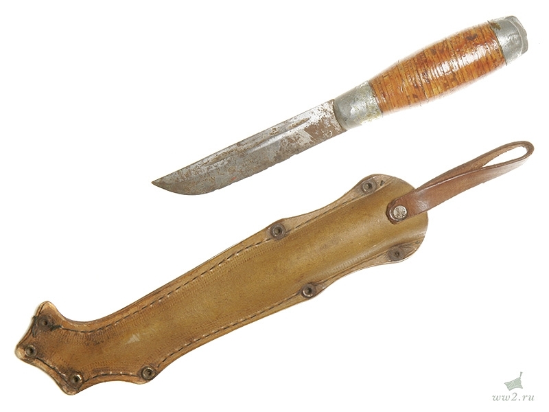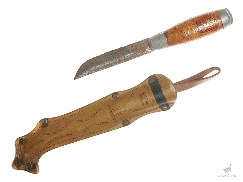 Финский традиционный нож "пукко" общей длиной 21 см. С финской гравированной надписью на клинке, в кожаных ножнах с надписью "Suomi", с наклеенным на рукоятке изображением финского герба. Вторая половина 1930-х годов. Хорошее состояние.
