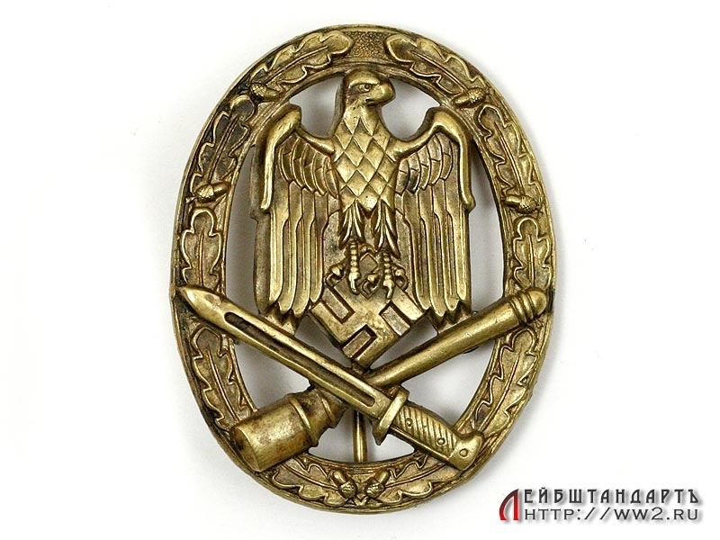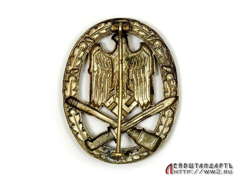 История: "Sturmabzeichen". Общий штурмовой знак был учрежден 1 июня 1940 года генерал-полковником Вальтером фон Браухичем для награждения вспомогательного персонала, который не мог претендовать на получение Пехотного или Танкового штурмового знака. Критерии для получения Общего штурмового знака были, в основном, такими же, как и для получения Пехотного или Танкового штурмового знака, одним из основных критериев было участие в трех атаках во вспомогательной роли. Первоначально знаком награждались солдаты инженерных войск, и знак назывался Штурмовой знак инженера. Но вскоре знаком стал награждаться и другой вспомогательный персонал: артиллеристы, стрелки, противотанковый, противовоздушный и медицинский персонал.