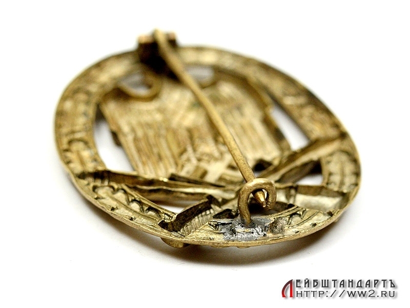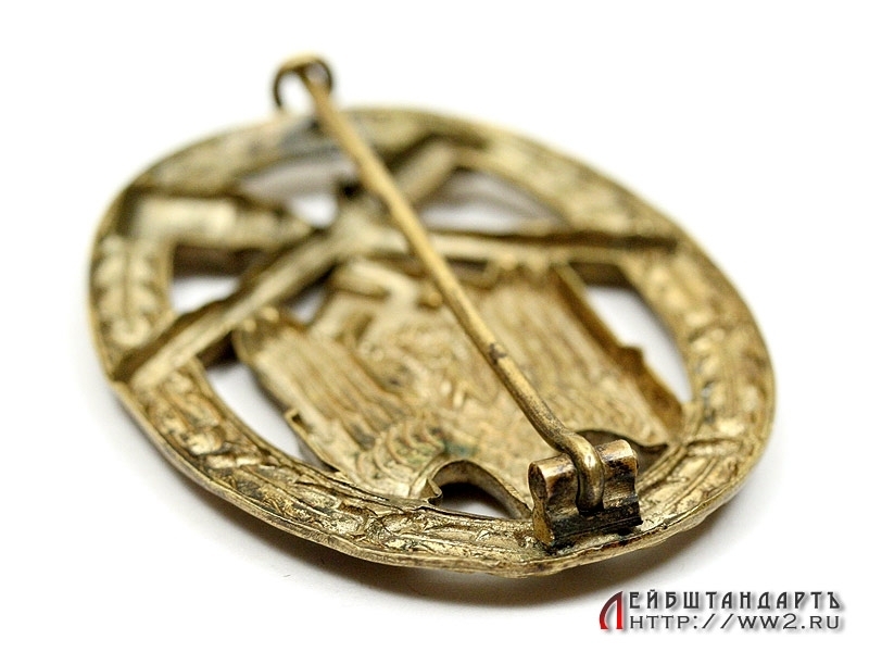 Квалификационный "Общий штурмовой знак" в очень хорошем состоянии. Изготовлен из томпака, без клейм. Крючок, видимо, шатался, и владелец подпаял его оловом: пайка практически незаметна.