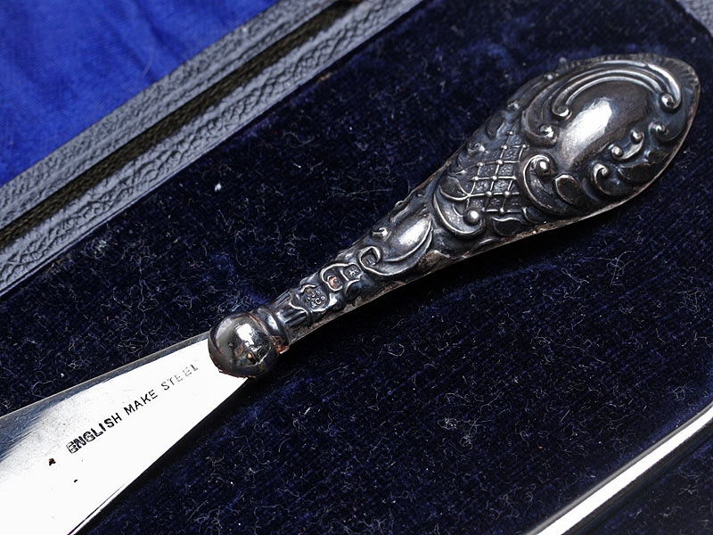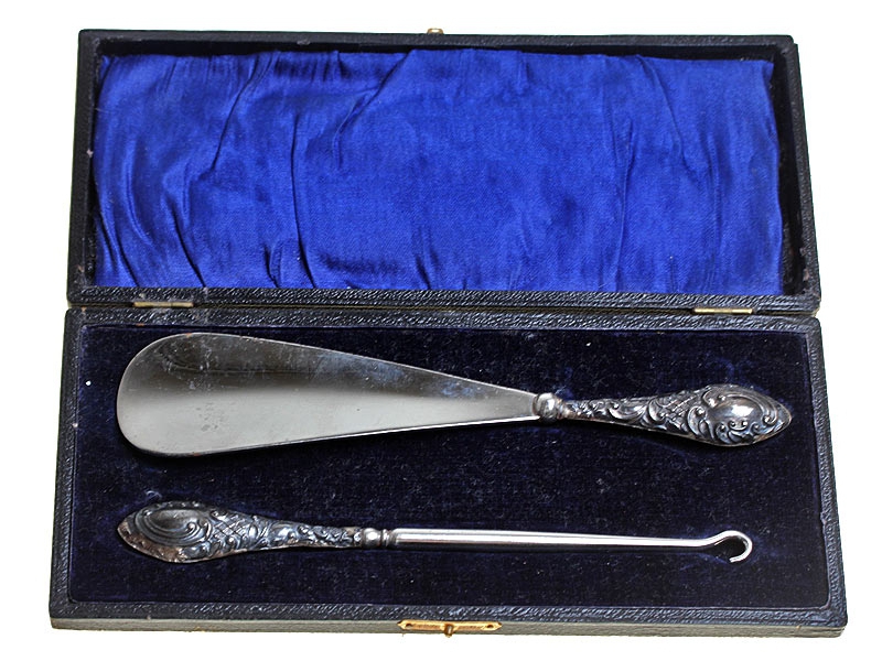 Набор для обуви из двух предметов: ложечки и крючка. Рукоятки изготовлены из серебра, набор в оригинальном футляре. Очень хорошее состояние.