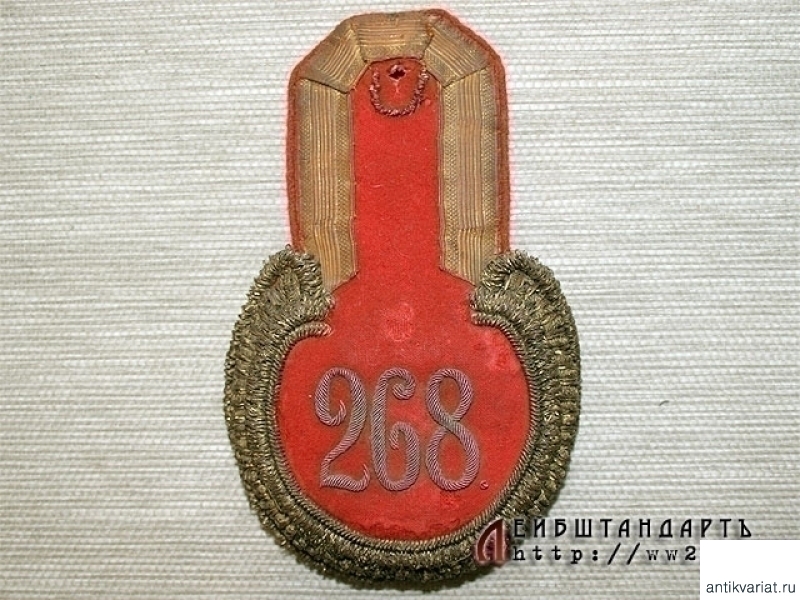 Одиночный эполет прапорщика 268 пехотного Пошехонского полка, входившего в состав 67 (22) пехотной дивизии. Предмет в очень хорошем состоянии, красная суконная основа лишь в нескольких местах незначительно тронута молью. Шитье и галун превосходно сохранились. Подложка отреставрирована.