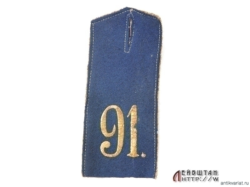 Одиночный погон рядового 91 пехотного Двинского полка. Погон односторонний, лицевая сторона из синего сукна с нанесенной краской шифровкой, изнанка защитного цвета .