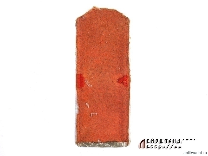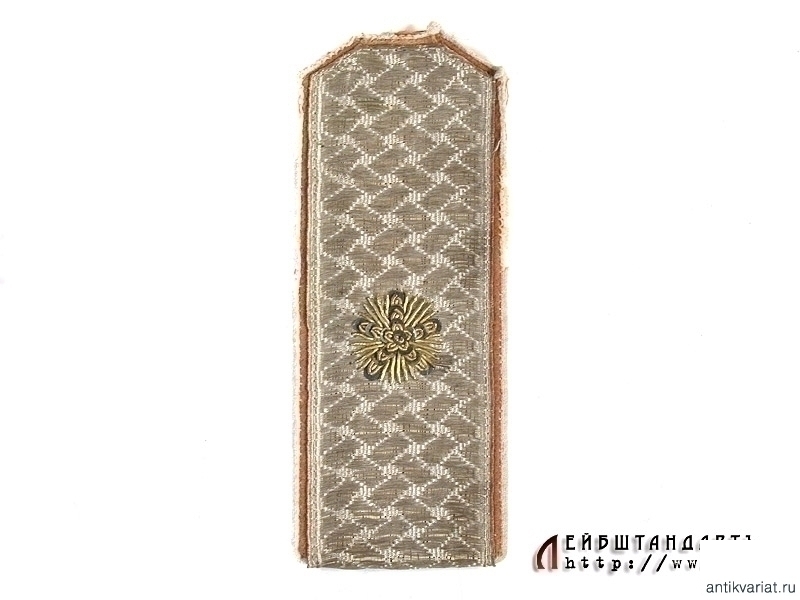Одиночный погон чиновника 5 класса Министерства Иностранных Дел (?). Погоны данного типа использовались с 1897 по 1917 год. На красной суконной подложке с белой выпушкой - шитый серебром погон с вышитой золотом сияющей пятиконечной звездой. Оборотная сторона также красная суконная. Предмет в хорошей сохранности.