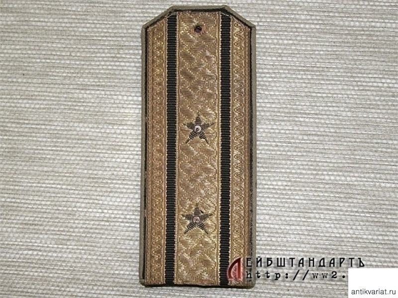 Одиночный погон чиновника 8 класса подразделения МВД. На черной суконной подложке - шитый золотом погон с двумя шитыми серебряными звездами и двумя черными просветами. С оборотной стороны находится черный суконный язычок. Предмет в хорошей сохранности.