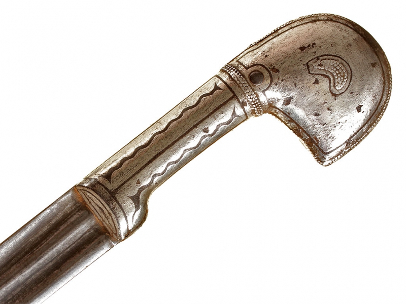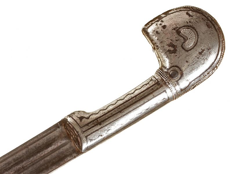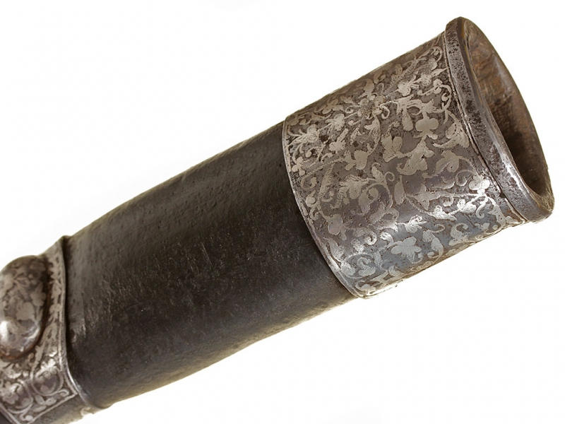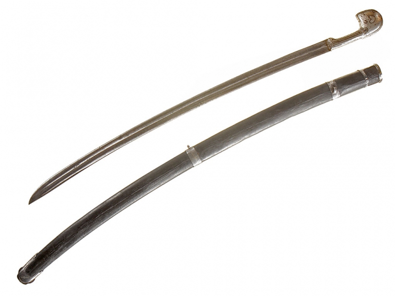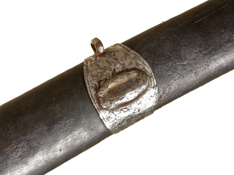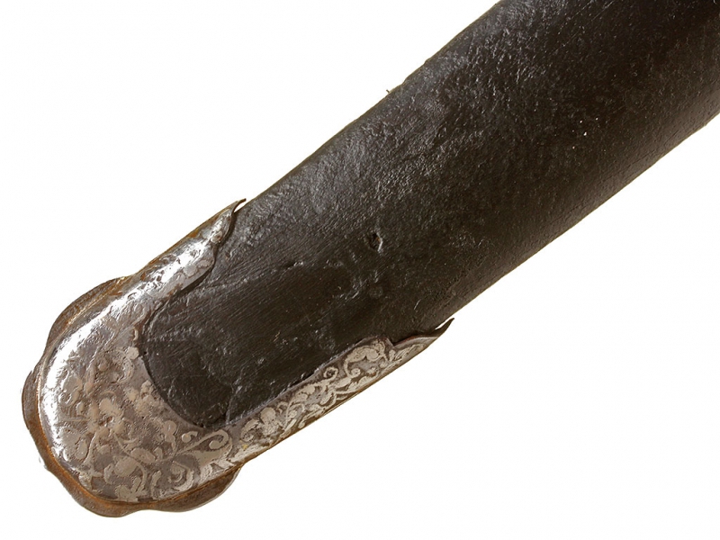 Кавказская шашка, изготовленная в конце XIX - начале ХХ века. Клинок незначительной кривизны, с двумя широкими долами. Без клейм. Рукоять шашки азиатского типа, стальная, полностью плакирована серебром. Поверхность рукояти украшена гравировкой, с залитыми чернью элементами. Ножны деревянные, обтянуты черной кожей. Прибор ножен стальной, с лицевой стороны украшен таушированным серебром растительным орнаментом, состоит из устья, двух обоймиц и наконечника.