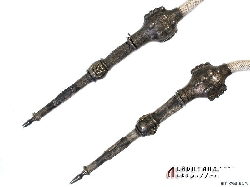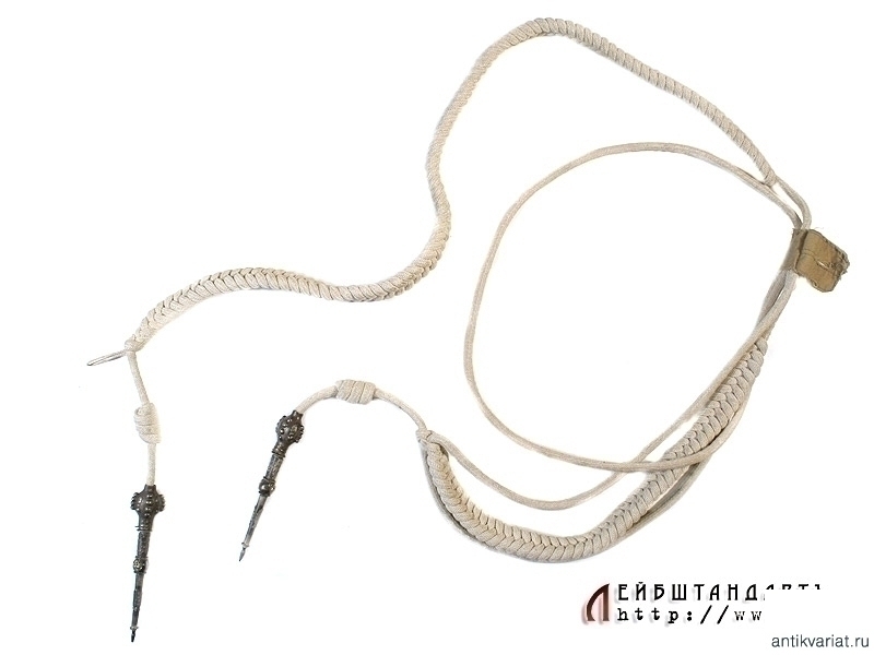 Офицерский аксельбант для полевой формы одежды. Хлопчатобумажный, что бывает редко: обычно аксельбанты такого типа сплетены из металлизированной нити. Наконечники посеребренные, с накладными изображениями двуглавых орлов. Аксельбант подойдет, к примеру, к полевому мундиру Лейб-Гвардии Московского полка, представленному на нашем сайте.