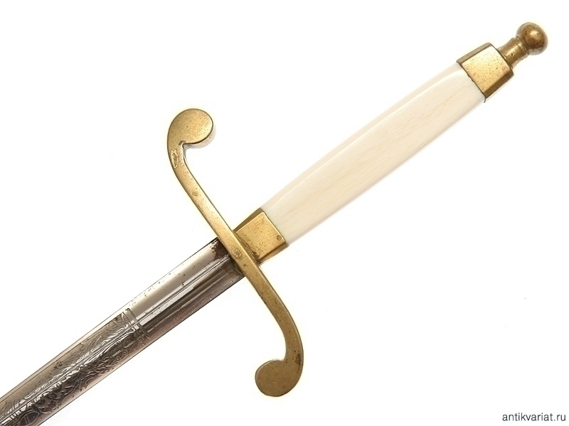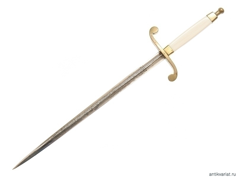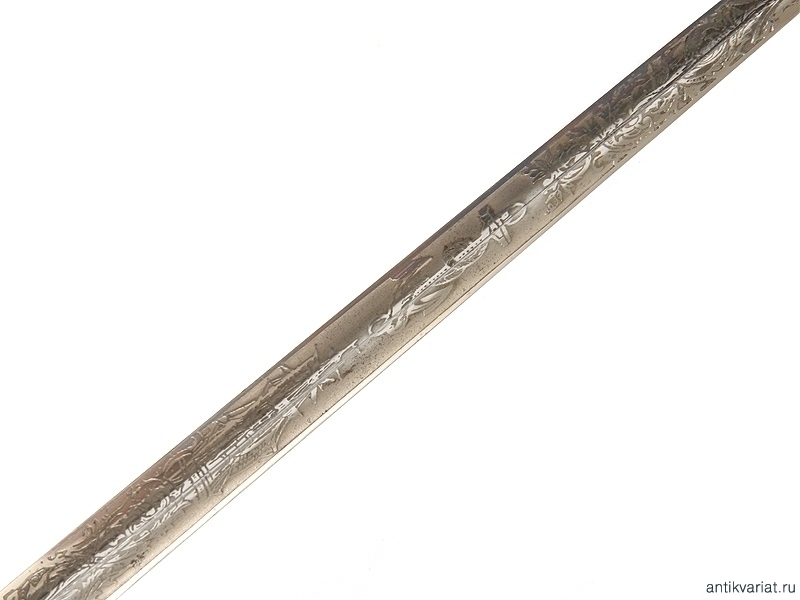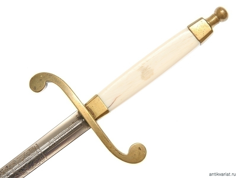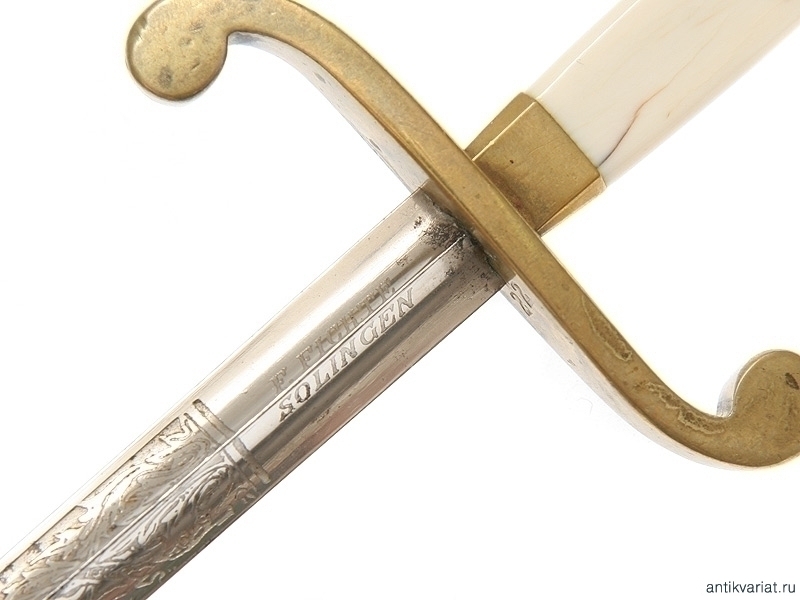 Офицерский морской кортик с заказным импортным клинком. Клинок изготовлен оружейной фирмой "F.Fichte" в Золингене, украшен травленым орнаментом и изображениями парусников. Покрыт никелем, превосходно сохранилось оригинальное покрытие. Рукоять костяная, прибор рукояти латунный. На гарде - клеймо "22". Очень хорошее состояние.