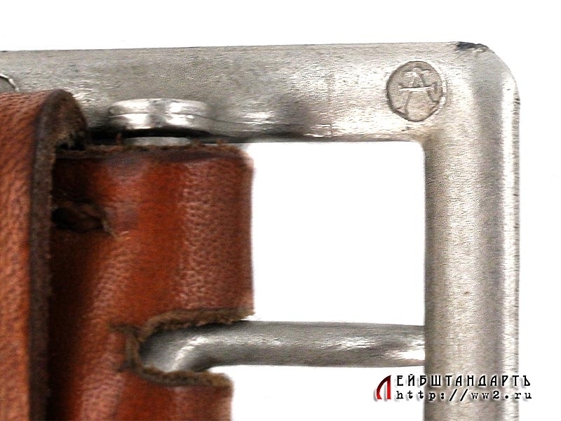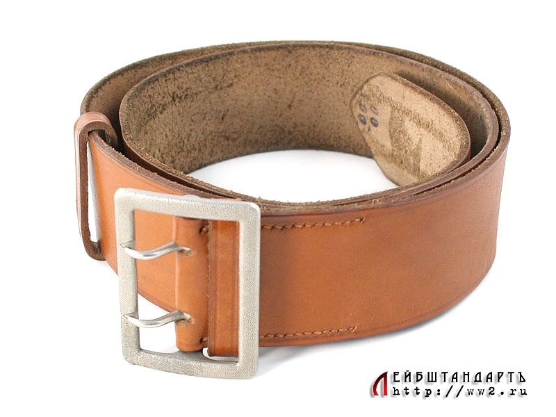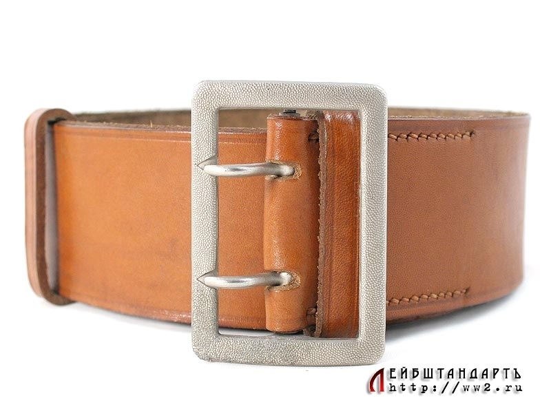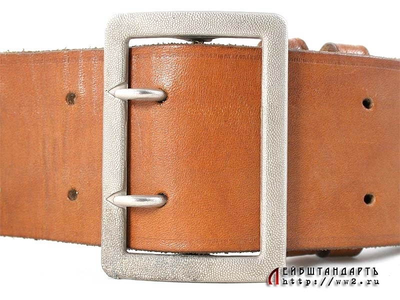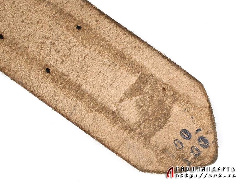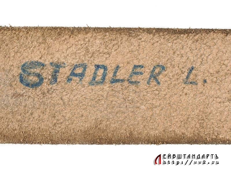 Ремень из светло-коричневой кожи с двузубой пряжкой, подходящий под любой офицерский мундир. В отличном состоянии, длина 100 см. На внутренней поверхности имеется подписанная фамилия владельца - "L.Stadler". Пряжка - цинковый сплав с покрытием, изготовлена известной фирмой "Assman", о чем свидетельствует соответствующее клеймо. Отличный коллекционный образец.