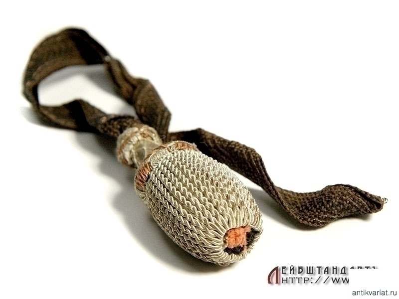 Русский офицерский темляк пехотного образца, подходящий для комплектации большинства видов холодного оружия, принятого в Русской Императорской Армии. Желудь из посеребреной нити, черная матерчатая лента в оригинальной прошивке посеребренной нитью. Предмет в абсолютно идеальной сохранности.
