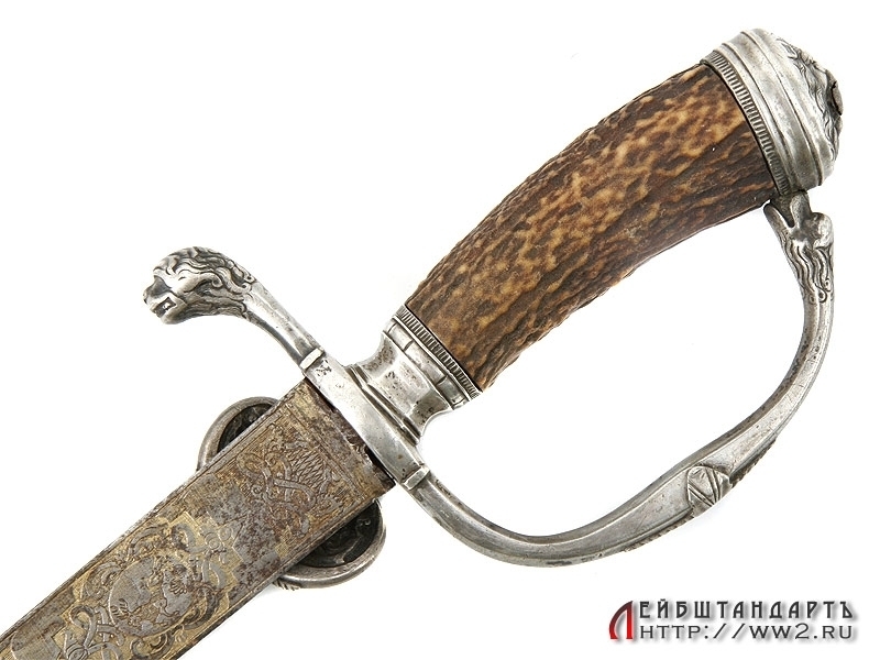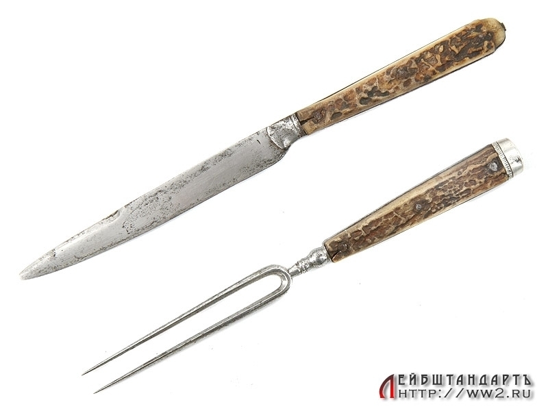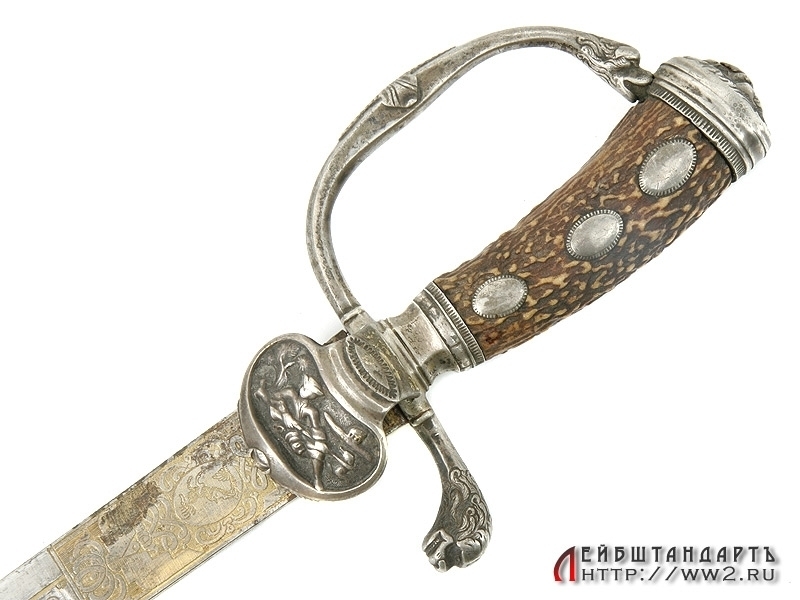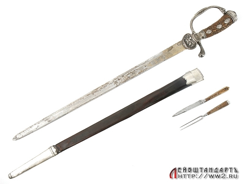 Кинжал охотничий германского изготовления с дополнительным карманом в ножнах, в который помещены нож и вилка. Первая половина XIX века. Ножны и чашка эфеса требуют реставрации.