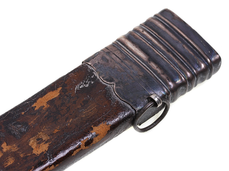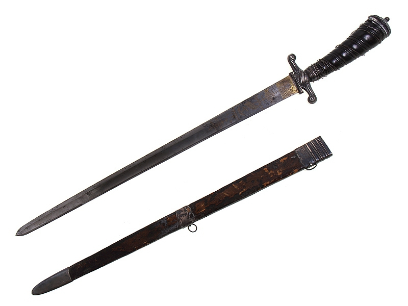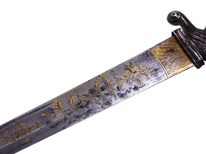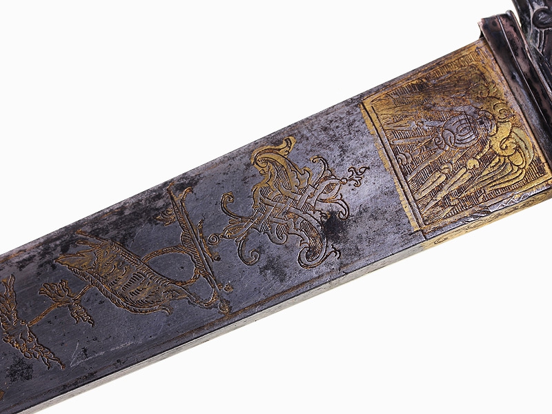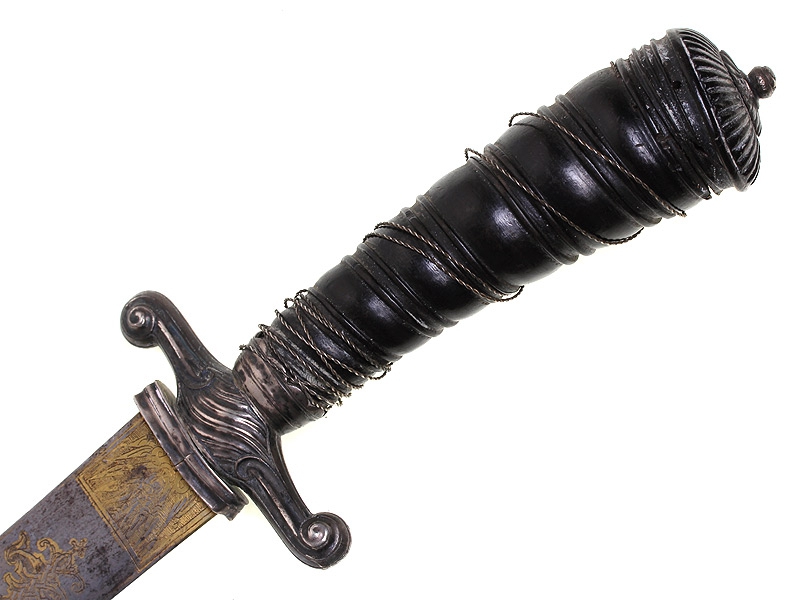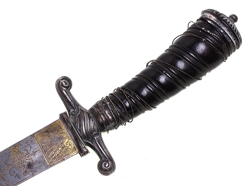 Охотничий кинжал, изготовленный в конце XVIII - начале XIX века. Клинок без клейм, украшен гравированным золоченым растительным орнаментом и изображениями оленя и вепря. Рукоять из витого черного рога, прибор рукояти изготовлен из серебра, без клейм. Ножны кожаные, с серебряным прибором.