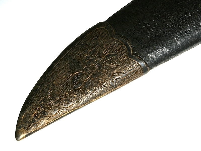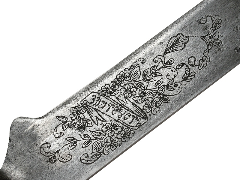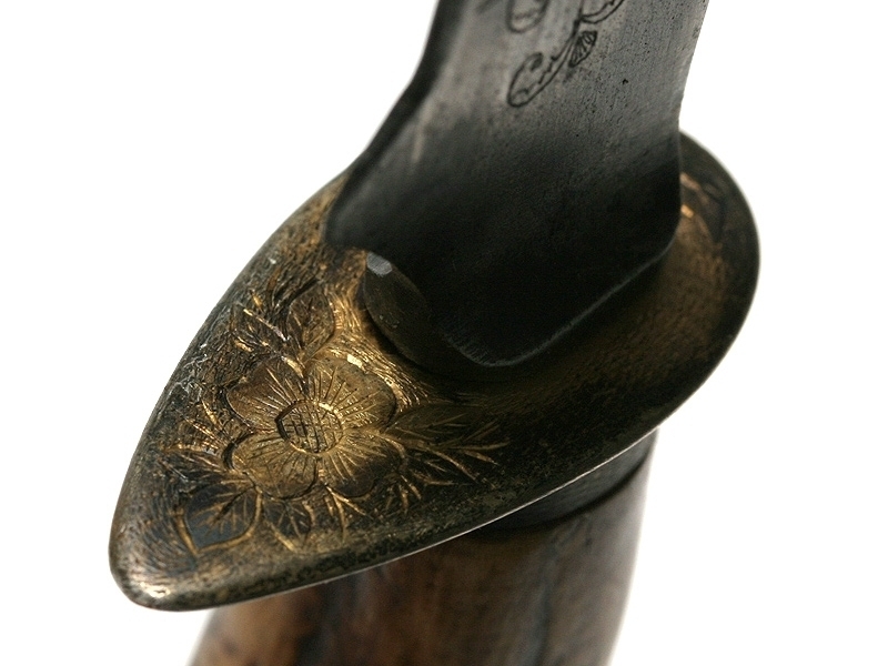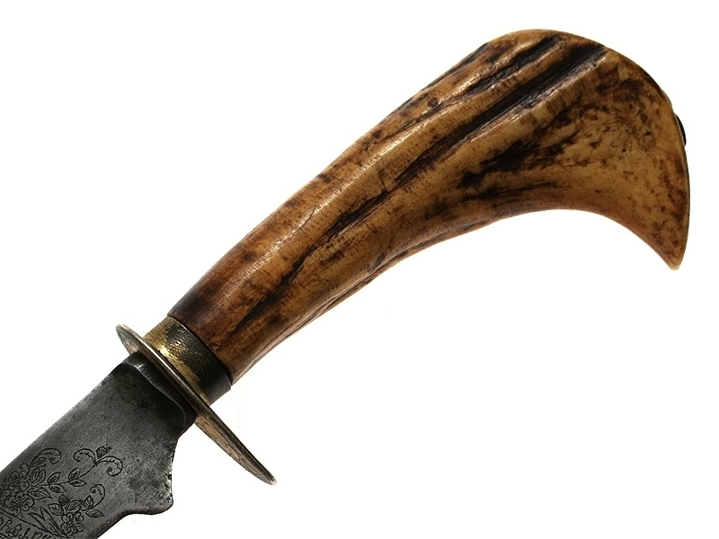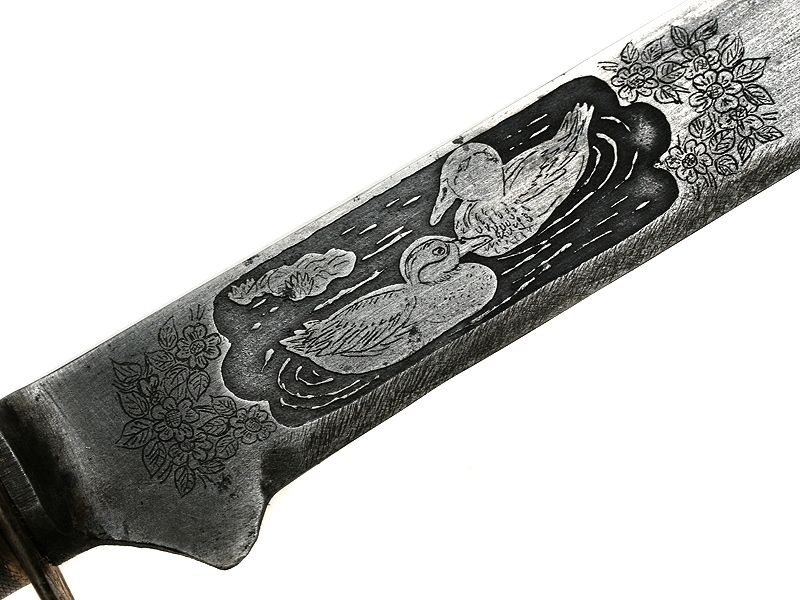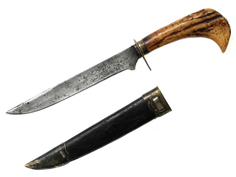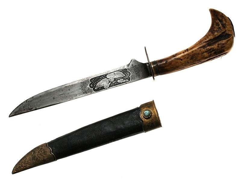Охотничий нож, изготовленный златоустовскими мастерами в начале ХХ века. Клинок с лицевой стороны украшен традиционной травленой орнаментальной розеткой с надписью "Златоустъ" на ленте, с оборотной стороны - декоративный травленый медальон с изображением утки и селезня. Рукоять из оленьего рога, прибор рукояти изготовлен из позолоченного белого металла (возможно, серебро - без клейм). Золочение частично сохранилось, красивая патина. Ножны деревянные, оклеены черной кожей, с украшенным гравировкой прибором. На устье ножен с лицевой стороны - каст с вставленной в него бирюзой.