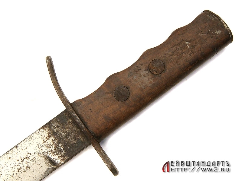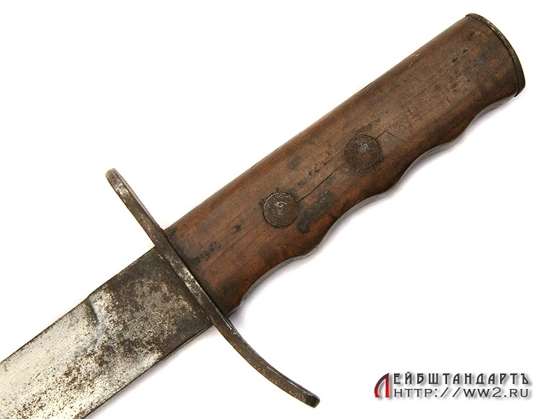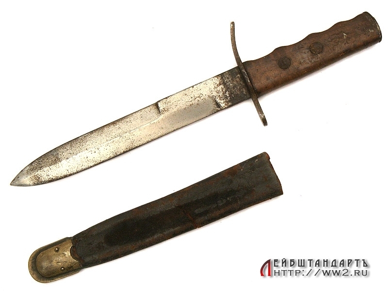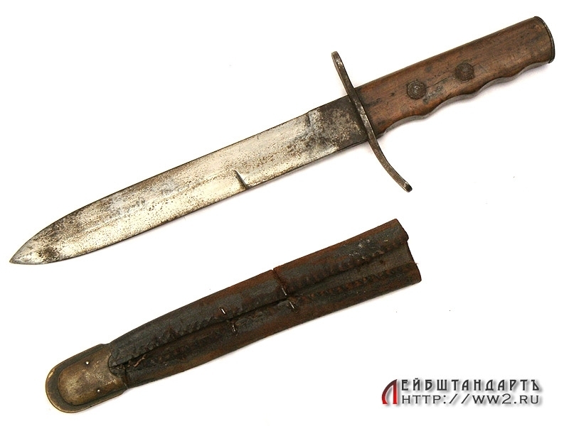 Окопный канадский нож времен Первой мировой войны в очень хорошем состоянии. Клинок без клейм, рукоять деревянная; ножны кожаные с латунным прибором, устье отсутствует.