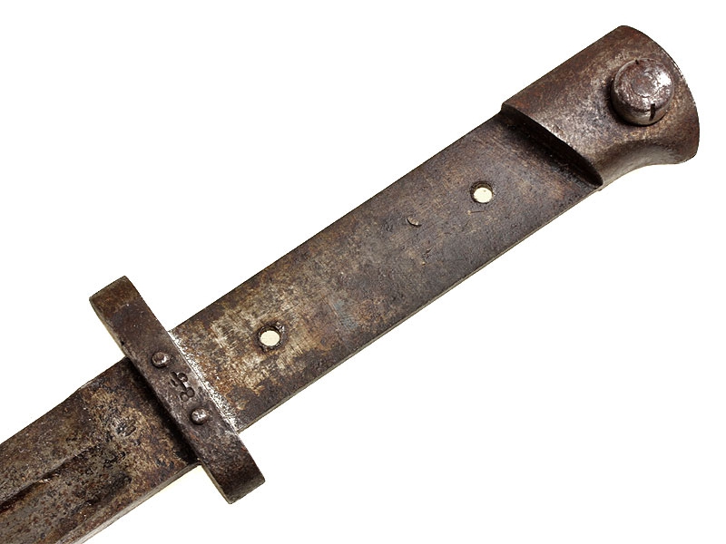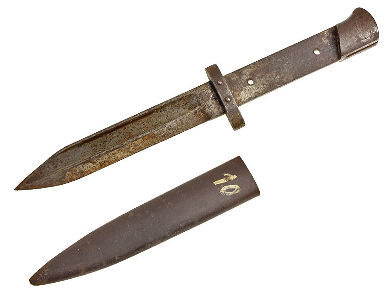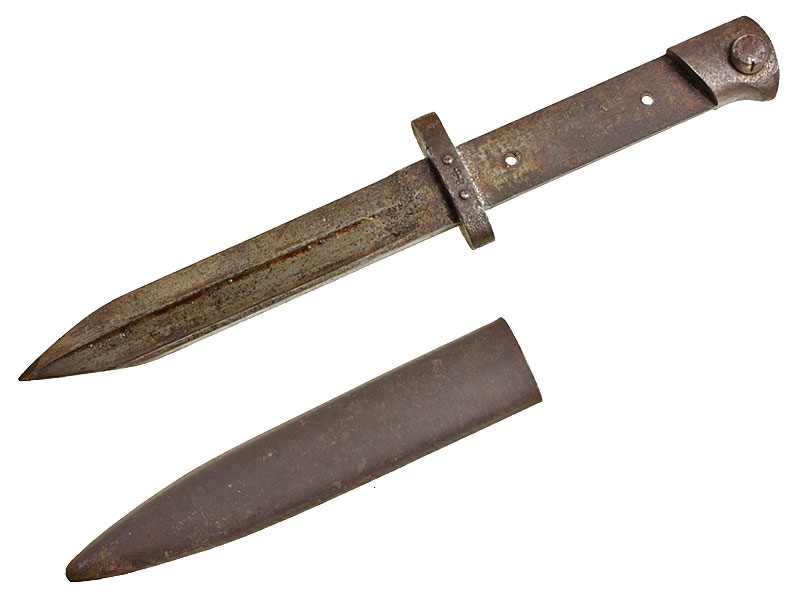Окопный самодельный нож, изготовленный из штыка к винтовке Манлихер образца 1895 года. Периода Первой мировой войны, клинок с приемочным клеймом KuK укорочен, накладки рукояти не сохранились. Ножны также обрезаны под длину клинка.