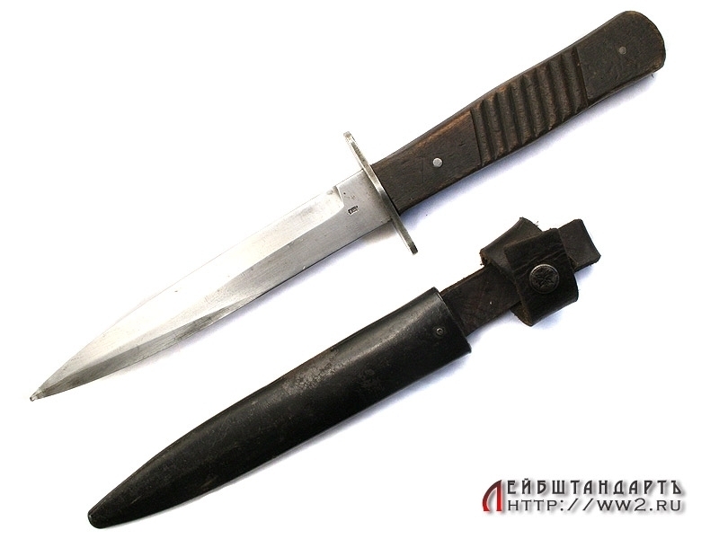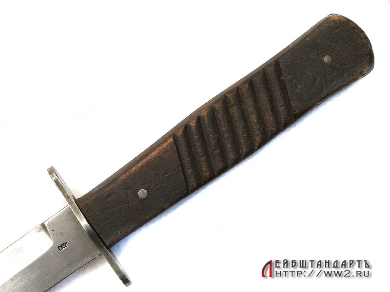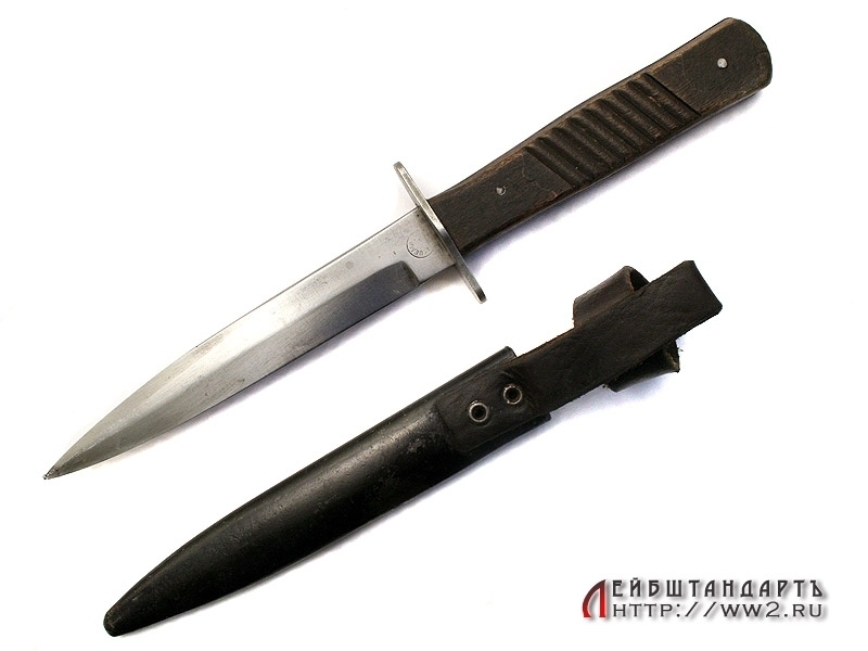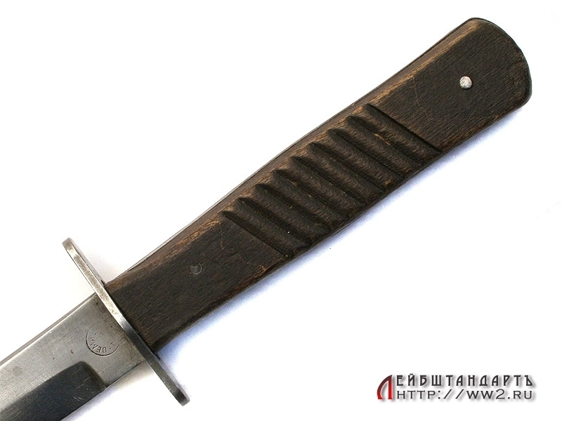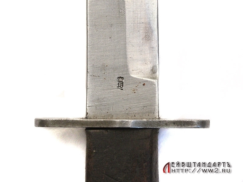Окопный нож времен Первой мировой войны в отличной сохранности. Клинок однолезвийный, с дополнительной заточкой, идущей до середины клинка. У основания клинка присутствует клеймо фирмы и Баварское клеймо приемки. Гарда прямая, рукоять снабжена деревянными щечками с поперечными косыми насечками.
