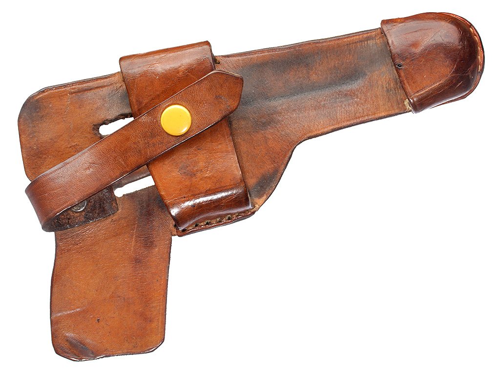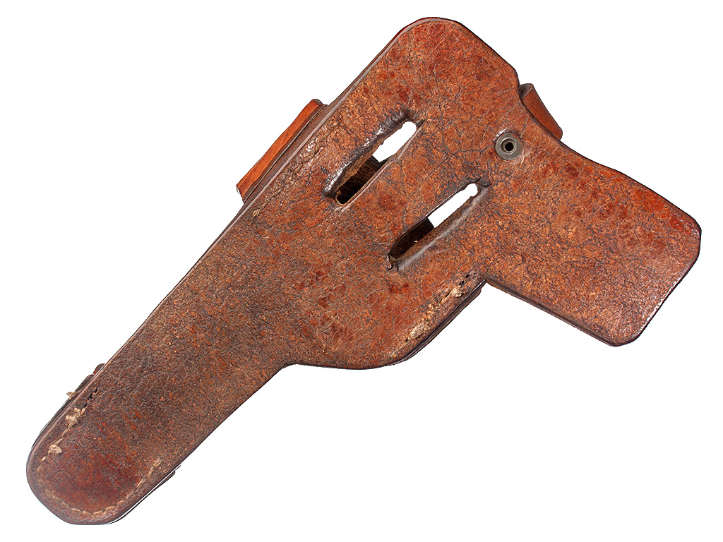 Оперативная поясная кобура для скрытого ношения пистолета "ТТ" выпуска 1930-х - 1940-х годов. Кожа, без клейм. Кобура имеет прорезь под узкий брючный ремень. Могла использоваться оперативниками НКВД / МГБ при гражданской одежде.
