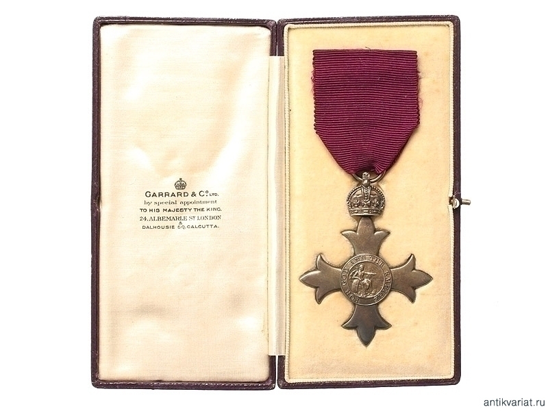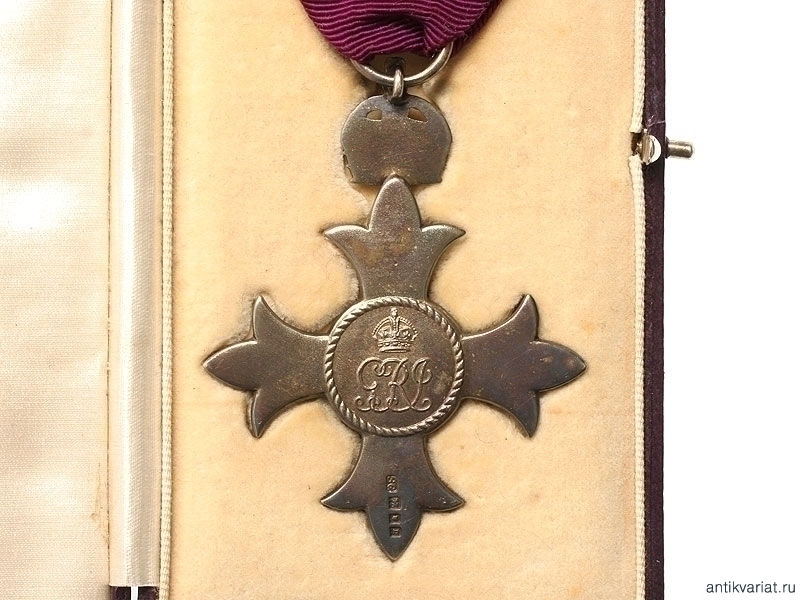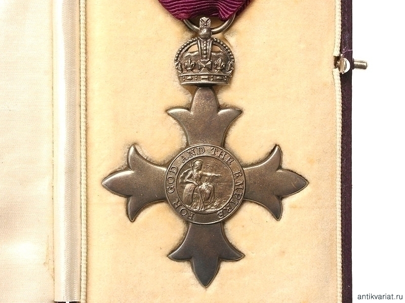 Орден Британской Империи 4-го класса периода Второй мировой войны. Серебро, на шелковой ленте, в оригинальном футляре с данными фирмы-изготовителя на внутренней стороне крышки.