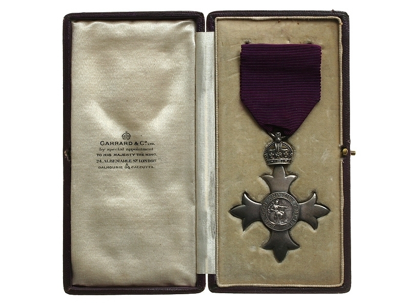 Орден Британской империи 4 класса, первого типа в оригинальном футляре, Первая Мировая война. На лицевой стороне надпись "За Бога и Империю", выпущен фирмой "Garrard & Co". Серебро, на шелковой ленте. Очень хорошее состояние.