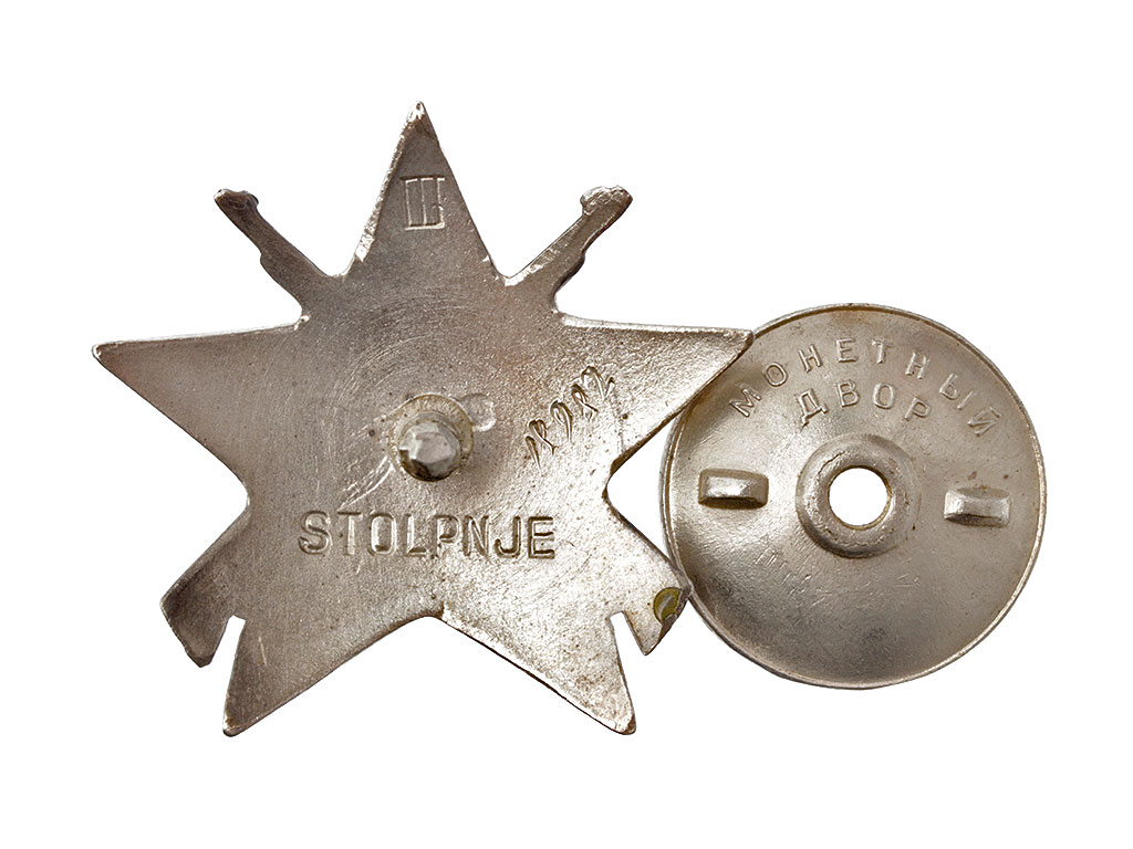 Орден Партизанской Звезды 3-й степени. Серебро, эмаль. На закрутке надпись в 2 строки: "Монетный двор".