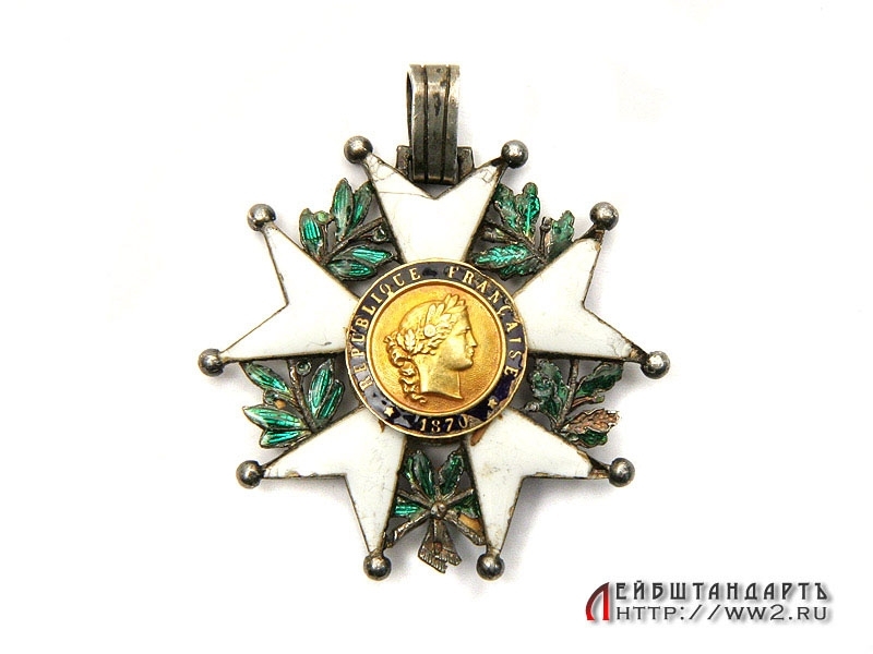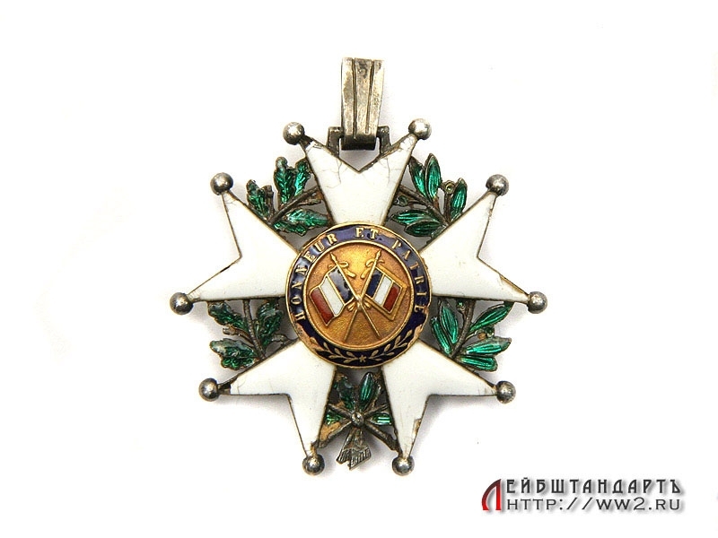 Знак ордена Почетного Легиона в средней степени сохранности. Изготовлен из серебра с золотыми центральными медальонами, на эмали имеются незначительные сколы.