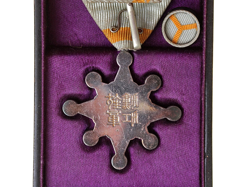 Орден Священного Сокровища 8-й степени в очень хорошем состоянии. На оригинальной колодке, в оригинальном черном лакированном деревянном футляре.