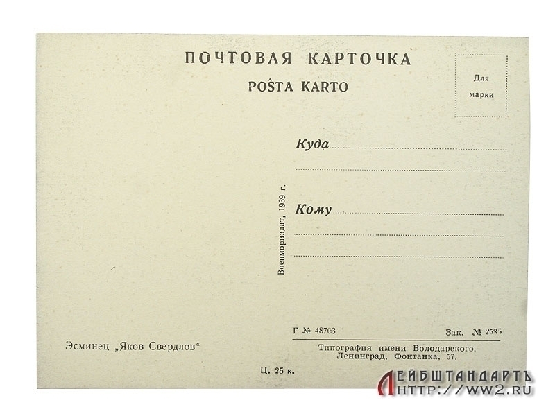 Открытка "Эсминец "Яков Свердлов", выпущенная Военмориздатом в 1939 году. Отличное состояние, незаполненная.