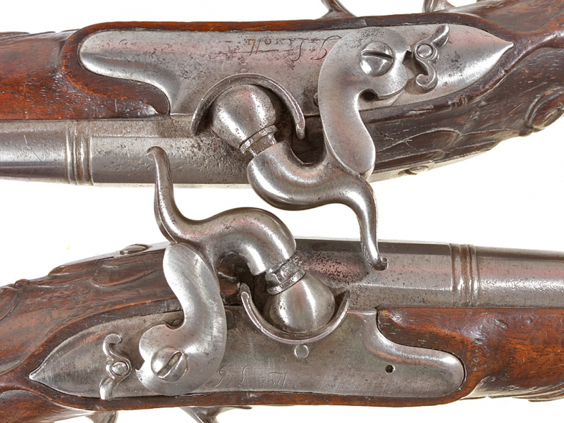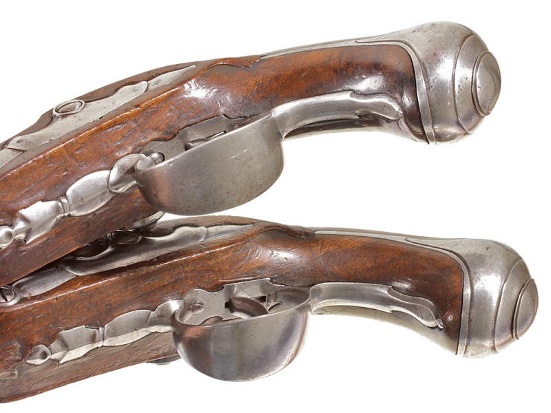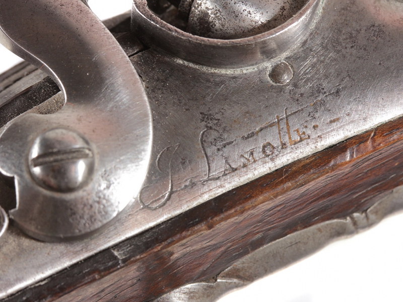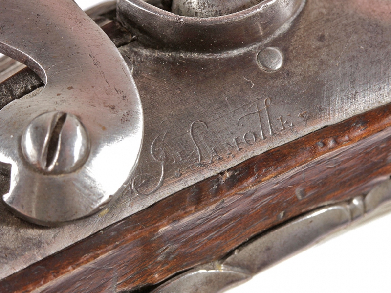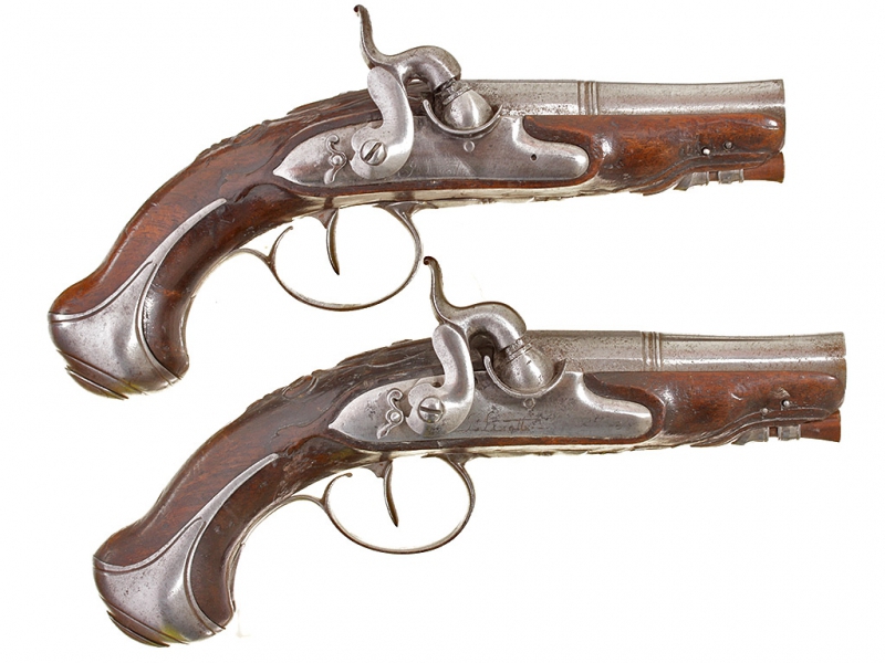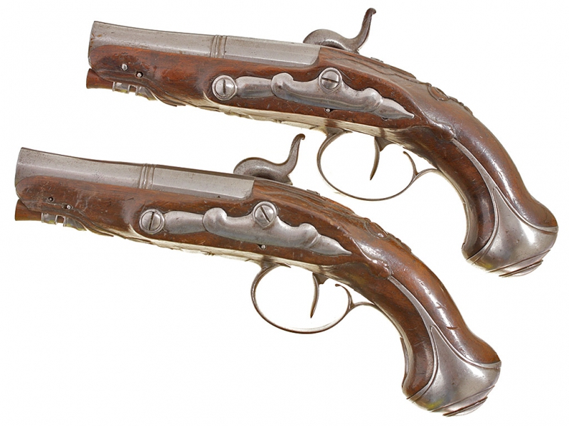 Пара классических жилетных пистолетов, изготовленных в третьей четверти XVIII века. Стволы не имеют нарезов, ничем не украшены, слегка расширяются к дульному срезу. Прицельные приспособления не предусмотрены. На замке каждого пистолета - миниатюрная гравированная надпись "J.Lamotte" (частная оружейная мастерская в Сен-Этьене в XVIII веке, Джозеф Ламот (1716 - 1784) был известен в первую очередь как поставщик кавалерийского оружия). Изначально замки были кремневыми, в XIX веке переделаны в капсюльные. Примечательно, что курки снабжены миниатюрными предохранителями, блокирующими курок во взведенном положении. Деревянная рукоять каждого пистолета украшена резным орнаментом. Очень хорошее состояние, замки исправны.